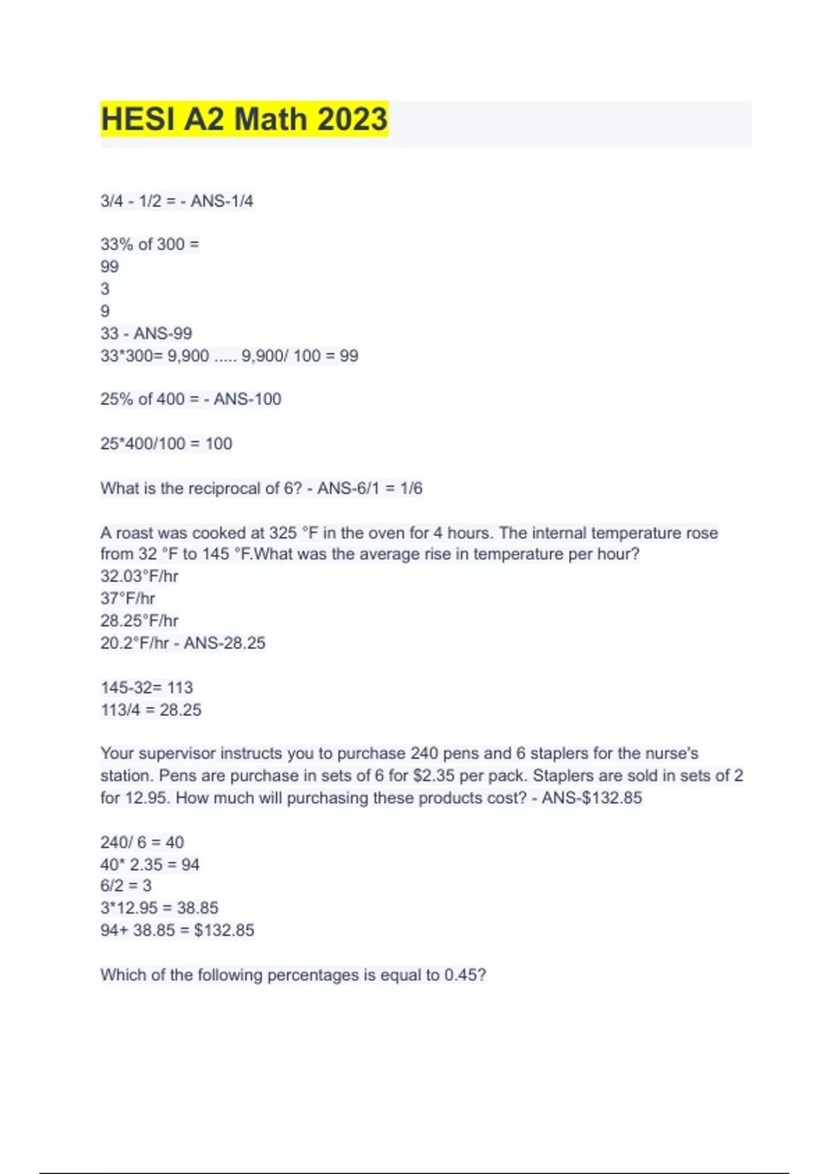 HESI A2 Math 2023 Verified Solutions
