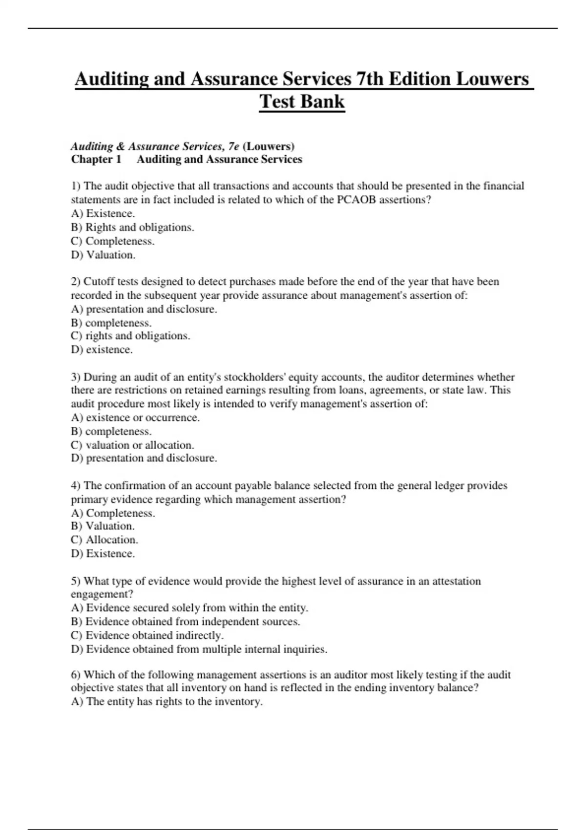 Test Bank for Auditing and Assurance Services 7th Edition Louwers / All Chapters 1 - 12 / Full Complete