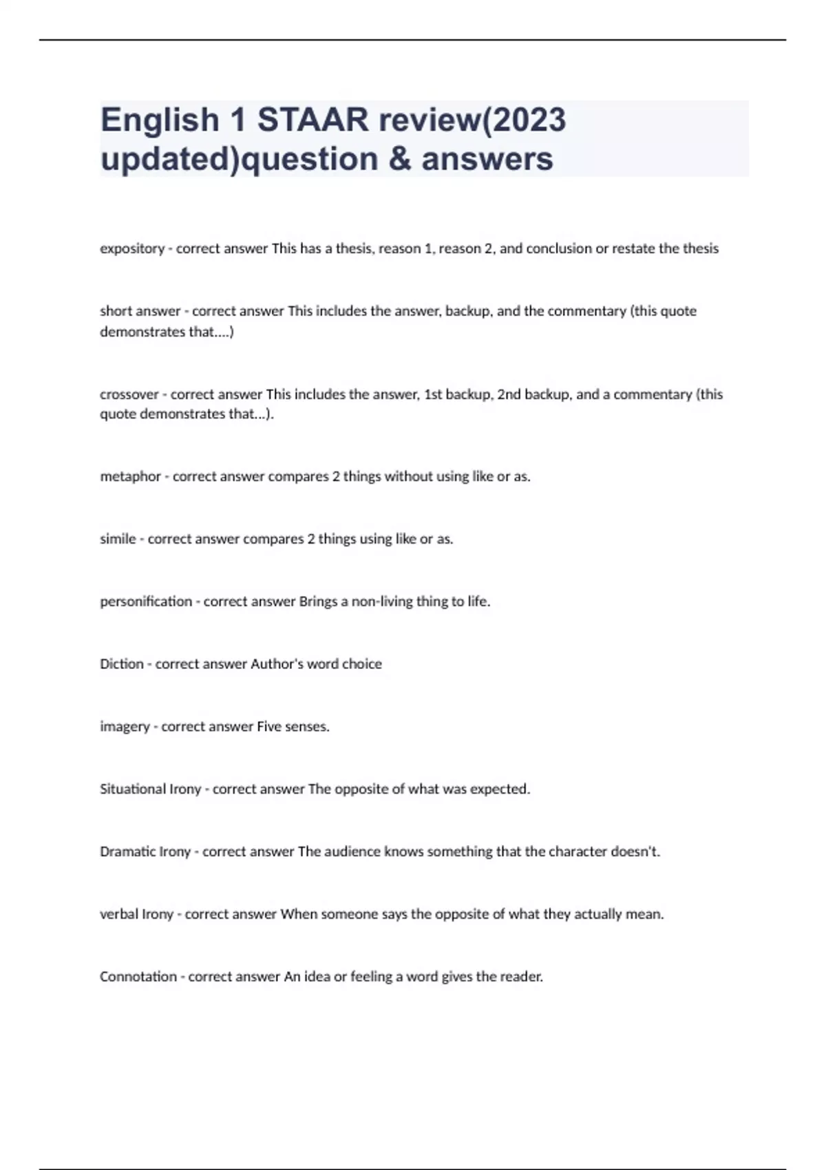 English 1 STAAR review(2023 updated)question & answers expository - correct answer This has a thesis, reason 1, reason 2, and conclusion or restate the thesis short answer - correct answer This includes the answer, backup, and the commentary (this quote demonstrates that....) crossover - correct answer This includes the answer, 1st backup, 2nd backup, and a commentary (this quote demonstrates that...). metaphor - correct answer compares 2 things without using like or as. simile - correct answer compares 2 things using like or as. personification - correct answer Brings a non-living thing to life. Diction - correct answer Author's word choice imagery - correct answer Five senses. Situational Irony - correct answer The opposite of what was expected. Dramatic Irony - correct answer The audience knows something that the character doesn't. verbal Irony - correct answer When someone says the opposite of what they actually mean. Connotation - correct answer An idea or feeling a word gives the reader.