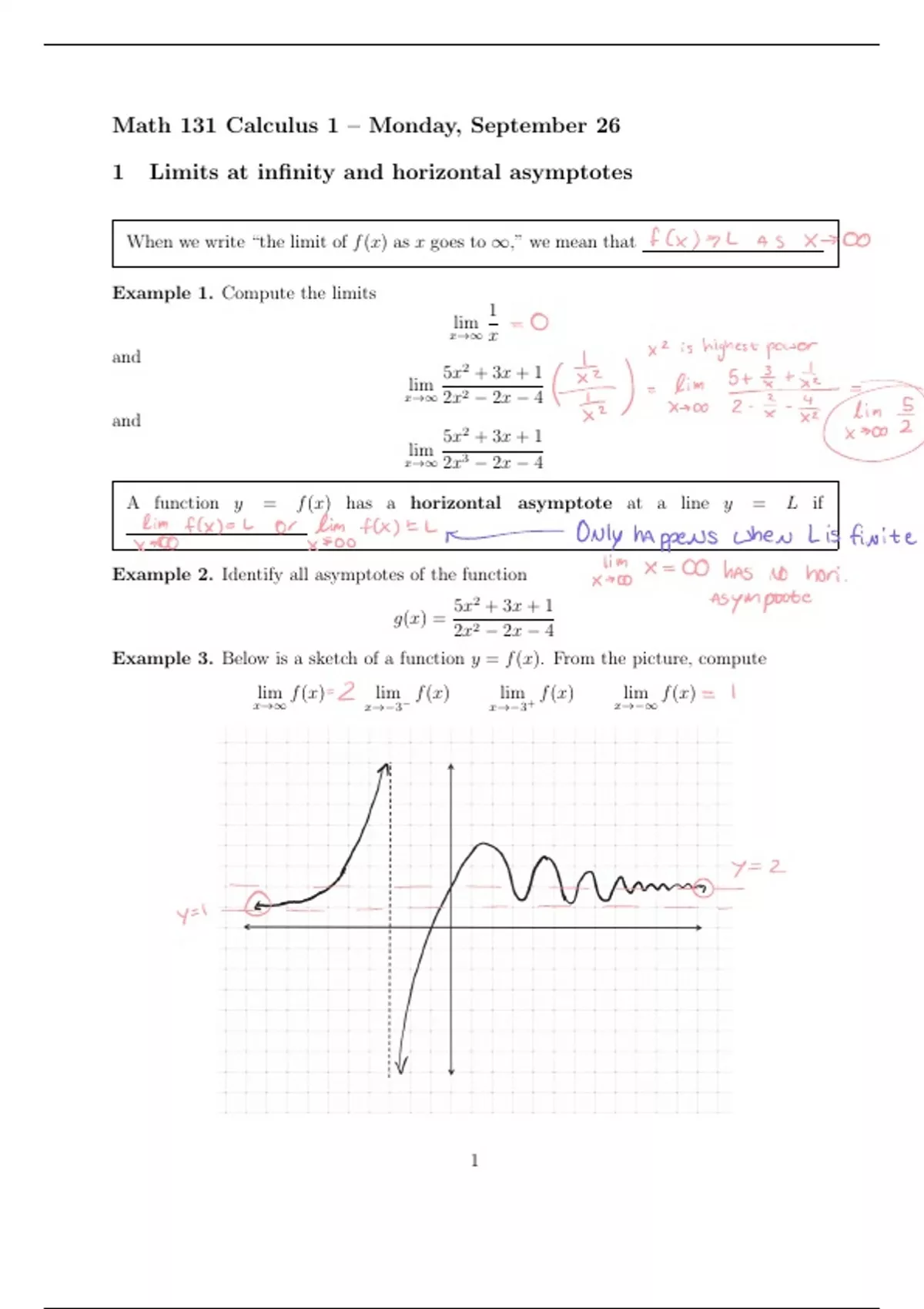 Finding & identifying horizontal asymptotes given functions, and being able to estimate limits given a graphical representation of the function. Also further info on vertical asymptotes.