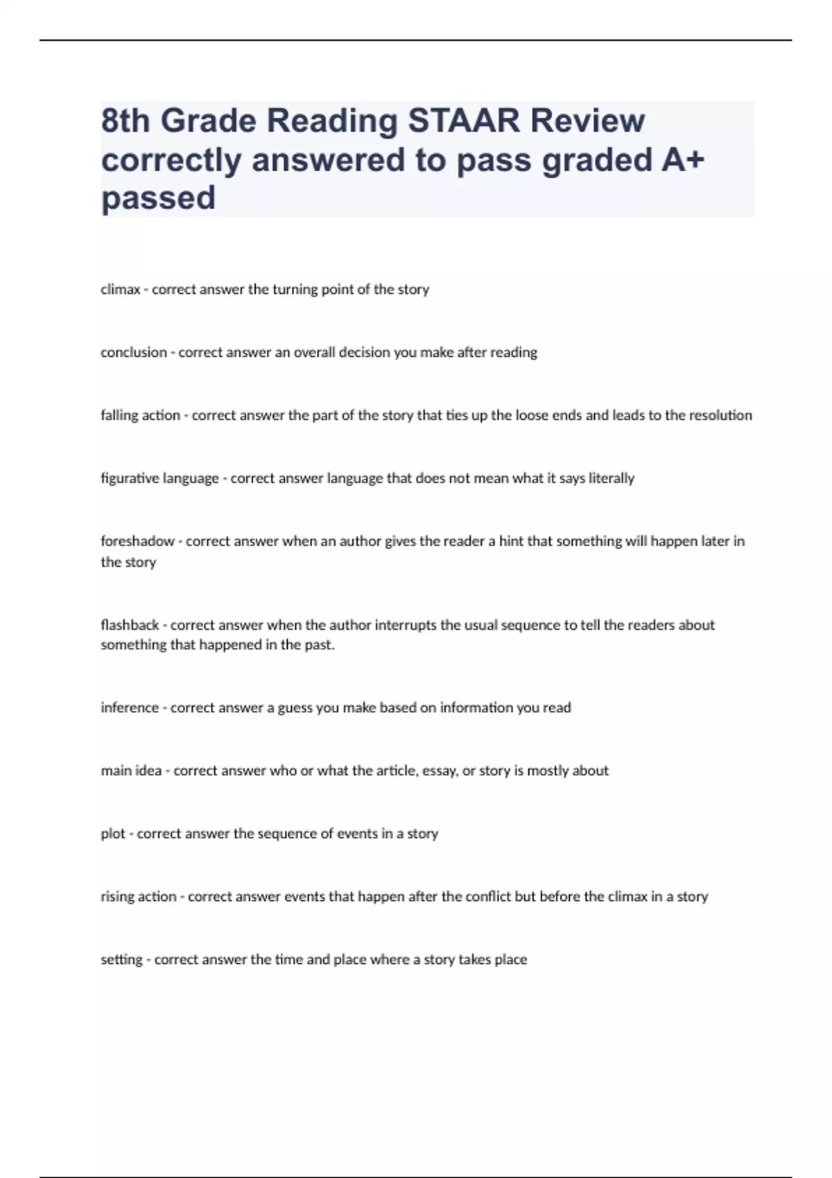 8th Grade Reading STAAR Review correctly answered to pass graded A+ passedclimax - correct answer the turning point of the story conclusion - correct answer an overall decision you make after reading falling action - correct answer the part of the story that ties up the loose ends and leads to the resolution figurative language - correct answer language that does not mean what it says literally foreshadow - correct answer when an author gives the reader a hint that something will happen later in the story flashback - correct answer when the author interrupts the usual sequence to tell the readers about something that happened in the past. inference - correct answer a guess you make based on information you read main idea - correct answer who or what the article, essay, or story is mostly about plot - correct answer the sequence of events in a story rising action - correct answer events that happen after the conflict but before the climax in a story setting - correct answer the time and place where a story takes place