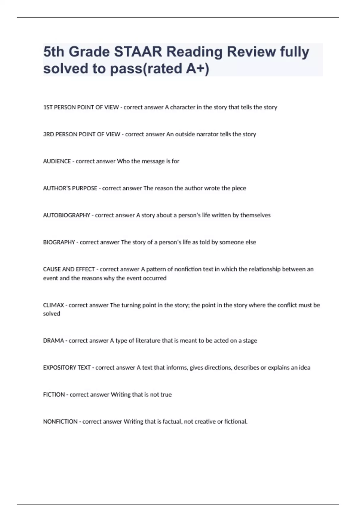 5th Grade STAAR Reading Review fully solved to pass(rated A+)1ST PERSON POINT OF VIEW - correct answer A character in the story that tells the story 3RD PERSON POINT OF VIEW - correct answer An outside narrator tells the story AUDIENCE - correct answer Who the message is for AUTHOR'S PURPOSE - correct answer The reason the author wrote the piece AUTOBIOGRAPHY - correct answer A story about a person's life written by themselves BIOGRAPHY - correct answer The story of a person's life as told by someone else CAUSE AND EFFECT - correct answer A pattern of nonfiction text in which the relationship between an event and the reasons why the event occurred CLIMAX - correct answer The turning point in the story; the point in the story where the conflict must be solved DRAMA - correct answer A type of literature that is meant to be acted on a stage EXPOSITORY TEXT - correct answer A text that informs, gives directions, describes or explains an idea FICTION - correct answer Writing that is not true NONFICTION - correct answer Writing that is factual, not creative or fictional.