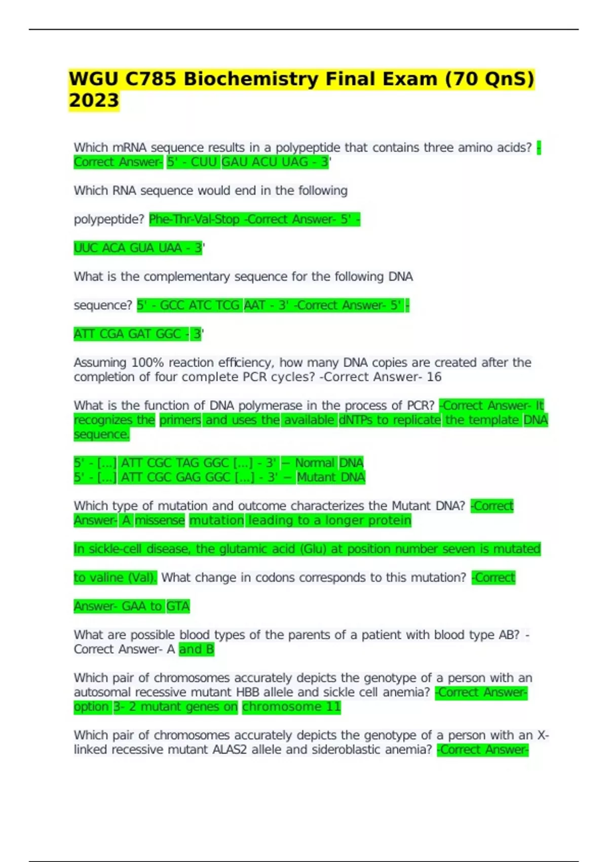 Which mRNA sequence results in a polypeptide that contains three amino acids? -Correct Answer- 5' - CUU GAU ACU UAG - 3' Which RNA sequence would end in the following polypeptide? Phe-Thr-Val-Stop -Correct Answer- 5' - UUC ACA GUA UAA - 3' What is the complementary sequence for the following DNA sequence? 5' - GCC ATC TCG AAT - 3' -Correct Answer- 5' - ATT CGA GAT GGC - 3' Assuming 100% reaction efficiency, how many DNA copies are created after the completion of four complete PCR cycles? -Correct Answer- 16