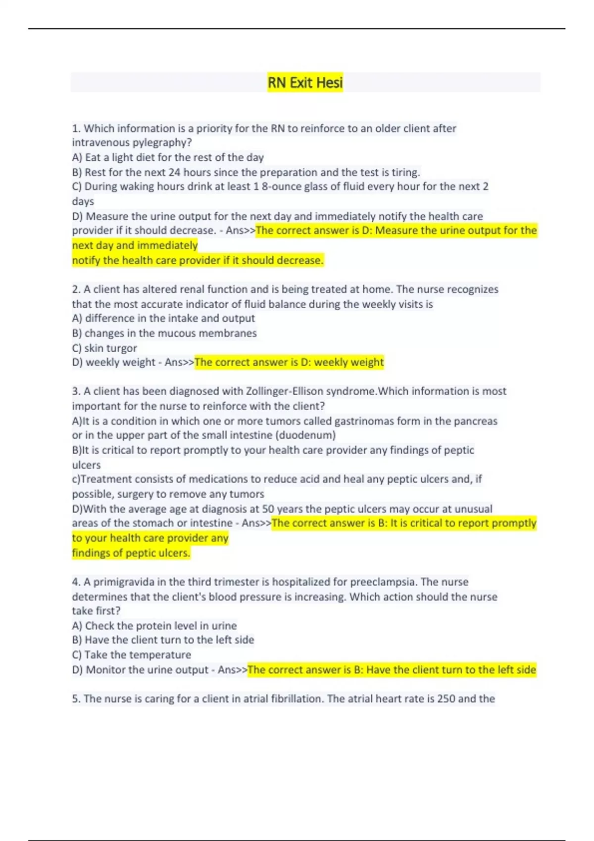 1. Which information is a priority for the RN to reinforce to an older client after intravenous pylegraphy? A) Eat a light diet for the rest of the day B) Rest for the next 24 hours since the preparation and the test is tiring. C) During waking hours drink at least 1 8-ounce glass of fluid every hour for the next 2 days D) Measure the urine output for the next day and immediately notify the health care provider if it should decrease. - AnsThe correct answer is D: Measure the urine output for the next day and immediately notify the health care provider if it should decrease. 2. A client has altered renal function and is being treated at home. The nurse recognizes that the most accurate indicator of fluid balance during the weekly visits is A) difference in the intake and output B) changes in the mucous membranes C) skin turgor D) weekly weight - AnsThe correct answer is D: weekly weight 3. A client has been diagnosed with Zollinger-Ellison syndrome.Which information is most important for the nurse to reinforce with the client? A)It is a condition in which one or more tumors called gastrinomas form in the pancreas or in the upper part of the small intestine (duodenum) B)It is critical to report promptly to your health care provider any findings of peptic ulcers c)Treatment consists of medications to reduce acid and heal any peptic ulcers and, if possible, surgery to remove any tumors D)With the average age at diagnosis at 50 years the peptic ulcers may occur at unusual areas of the stomach or intestine - AnsThe correct answer is B: It is critical to report promptly to your health care provider any findings of peptic ulcers. 4. A primigravida in the third trimester is hospitalized for preeclampsia. The nurse determines that the client's blood pressure is increasing. Which action should the nurse take first? A) Check the protein level in urine B) Have the client turn to the left side C) Take the temperature D) Monitor the urine output - AnsThe correct answer is B: Have the client turn to the left side 5. The nurse is caring for a client in atrial fibrillation. The atrial heart rate is 250 and the ventricular rate is controlled at 75. Which of the following findings is cause for the most concern? A) Diminished bowel sounds B) Loss of appetite C) A cold, pale lower leg D) Tachypnea - AnsThe correct answer is C: A cold, pale lower leg 6. The client with infective endocarditis must be assessed frequently by the home health nurse. Which finding suggests that antibiotic therapy is not effective, and must be reported by the nurse immediately to the healthcare provider? A) Nausea and vomiting B) Fever of 103 degrees Fahrenheit (39.5 degrees Celsius) C) Diffuse macular rash D) Muscle tenderness - AnsThe correct answer is B: Fever of 103 degrees F (39.5 degrees C) 7. A client who had a vasectomy is in the post recovery unit at an outpatient clinic. Which of these points is most important to be reinforced by the nurse? A) Until the health care provider has determined that your ejaculate doesn't contain sperm, continue to use another form of contraception. B)This procedure doesn't impede the production of male hormones or the production of sperm in the testicles. The sperm can no longer enter your semen and no sperm are in your ejaculate. C) After your vasectomy, strenuous activity needs to be avoided for at least 48 hours. If your work doesn't involve hard physical labor, you can return to your job as soon as you feel up to it. The stitches generally dissolve in seven to ten days. D)The health care provider at this clinic recommends rest, ice, an athletic supporter or over-the-counter pain medication to relieve any discomfort. - AnsThe correct answer is A: Until the health care provider has determined that your ejaculate doesn't contain sperm, continue to use another form of contraception. 8. A client who is to have antineoplastic chemotherapy tells the nurses of a fear of being sick all the time and wishes to try acupuncture. Which of these beliefs stated by the client would be incorrect about acupuncture? A)Some needles go as deep as 3 inches, depending on where they're placed in the body and what the treatment is for. The needles usually are left in for 15 to 30 minutes. B) In traditional Chinese medicine, imbalances in the basic energetic flow of life — known as qi or chi — are thought to cause illness. * C) The flow of life is believed to flow through major pathways or nerve clusters in your body. D) By inserting extremely fine needles into some of the over 400 acupuncture points in various combinations it is believed that energy flow will rebalance to allow the body's natural healing mechanisms to take over. - AnsThe correct answer is C: The flow of life is believed to flow through major pathways or nerve clusters in your body.
