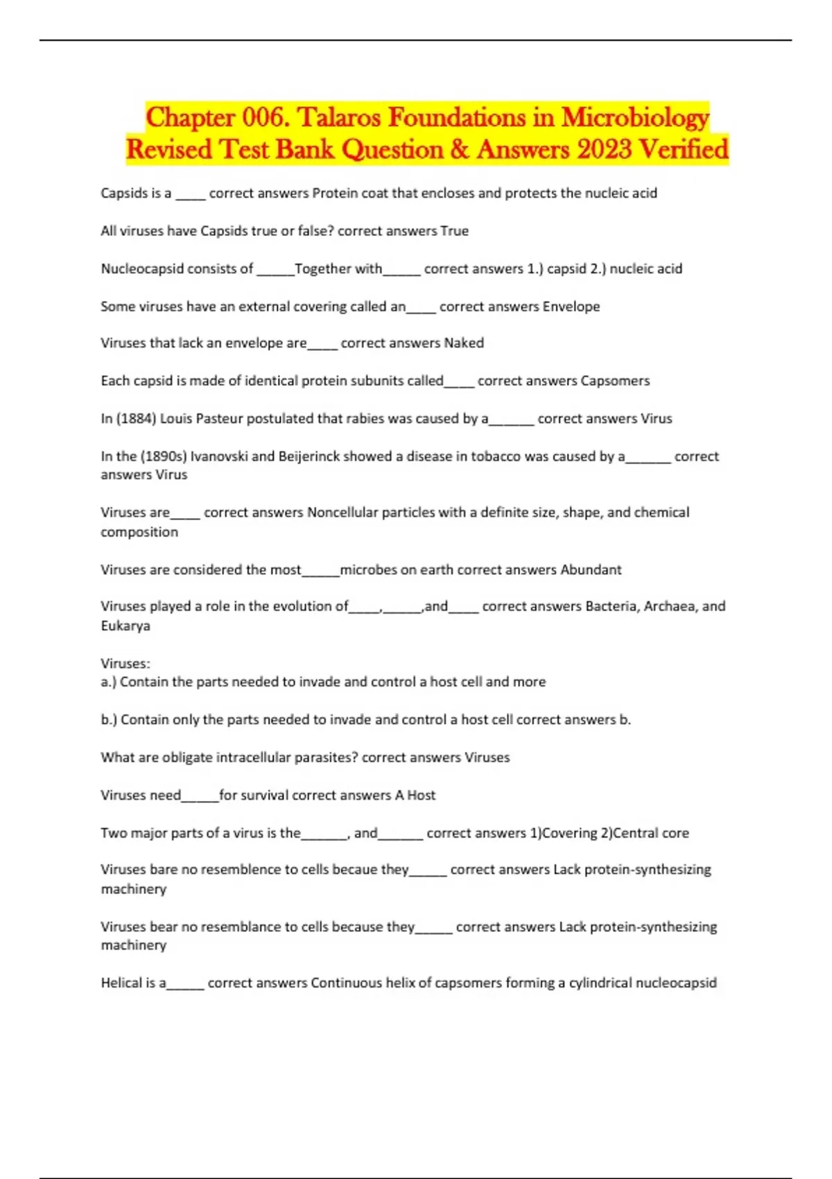Chapter 003. Talaros Foundations in Microbiology Revised Test Bank Question & Answers 2023 Verified Capsids is a ____ correct answers Protein coat that encloses and protects the nucleic acid All viruses have Capsids true or false? correct answers True Nucleocapsid consists of _____Together with_____ correct answers 1.) capsid 2.) nucleic acid Some viruses have an external covering called an____ correct answers Envelope Viruses that lack an envelope are____ correct answers Naked Each capsid is made of identical protein subunits called____ correct answers Capsomers In (1884) Louis Pasteur postulated that rabies was caused by a______ correct answers Virus In the (1890s) Ivanovski and Beijerinck showed a disease in tobacco was caused by a______ correct answers Virus Viruses are____ correct answers Noncellular particles with a definite size, shape, and chemical composition Viruses are considered the most_____microbes on earth correct answers Abundant Viruses played a role in the evolution of____,_____,and____ correct answers Bacteria, Archaea, and Eukarya Viruses: a.) Contain the parts needed to invade and control a host cell and more b.) Contain only the parts needed to invade and control a host cell correct answers b. What are obligate intracellular parasites? correct answers Viruses Viruses need_____for survival correct answers A Host Two major parts of a virus is the______, and______ correct answers 1)Covering 2)Central core Viruses bare no resemblence to cells becaue they_____ correct answers Lack protein-synthesizing machinery Viruses bear no resemblance to cells because they_____ correct answers Lack protein-synthesizing machinery Helical is a_____ correct answers Continuous helix of capsomers forming a cylindrical nucleocapsid Name the two general structures of a virus correct answers 1)Helical 2)Icosahedral Icosahedral is a shape that is_____with______ correct answers 1) 20-sided with 2) 12 corners Viral envelope are: 1)Mostly____viruses 2)Acquired when the virus leaves the_____ 3)Exposed proteins on the outside of the envelope, called spikes, that are essential for______ correct answers 1) Animal 2) Host cell 3) Attachment of the virus to the host cell The Capsid/Envelope Protects the_____when the virus is outside of the host cell correct answers Nucleic acid The Capsid/Envelope Helps the virus bind to a____and assists the penetration of the_____into a suitable host cell correct answers 1) Cell surface 2) Viral DNA or RNA
