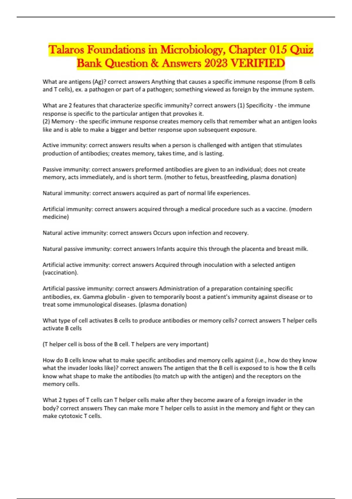 Talaros Foundations in Microbiology, Chapter 015 Quiz Bank Question & Answers 2023 VERIFIED