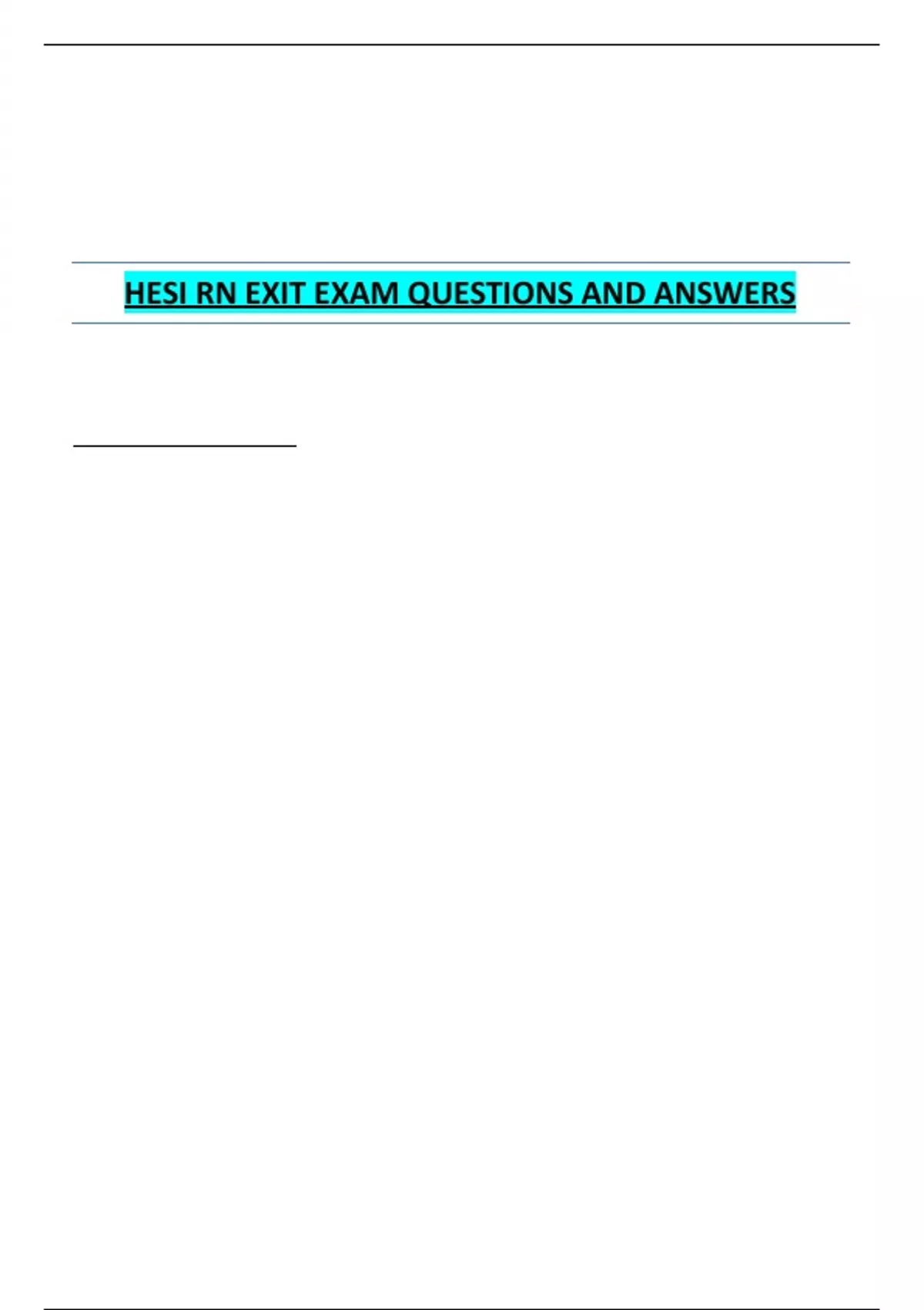 HESI RN EXIT Exam Questions and Answers1. In planning care for a 6 month-old infant, what must the nurse provide to assist in the development of trust? A) Food B) Warmth C) Security D) Comfort 2. A nurse has just received a medication order which is not legible. Which statement best reflects assertive communication? A) "I cannot give this medication as it is written. I have no idea of what you mean." B) "Would you please clarify what you have written so I am sure I am reading it correctly?" C) "I am having difficulty reading your handwriting. It would save me time if you would be more careful." D) "Please print in the future so I do not have to spend extra time attempting to read your writing." 3. What is the most important consideration when teaching parents how to reduce risks in the home? A) Age and knowledge level of the parents B) Proximity to emergency services C) Number of children in the home D) Age of children in the home 4. A 35 year-old client with sickle cell crisis is talking on the telephone but stops as the nurse enters the room to request something for pain. The nurse should A) Administer a placebo B) Encourage increased fluid intake C) Administer the prescribed analgesia D) Recommend relaxation exercises for pain control 5. While caring for a toddler with croup, which initial sign of croup requires the nurse's immediate attention? A) Respiratory rate of 42 B) Lethargy for the past hour C) Apical pulse of 54 D) Coughing up copious secretions 6. A client is admitted with low T3 and T4 levels and an elevated TSH level. On initial assessment, the nurse would anticipate which of the following assessment findings? A) Lethargy B) Heat intolerance C) Diarrhea D) Skin eruptions 7. The emergency room nurse admits a child who experienced a seizure at school. The father comments that this is the first occurrence, and denies any family history of epilepsy. What is the best response by the nurse? A) "Do not worry. Epilepsy can be treated with medications." B) "The seizure may or may not mean your child has epilepsy." C) "Since this was the first convulsion, it may not happen again." D) "Long term treatment will prevent future seizures." 8. Alcohol and drug abuse impairs judgment and increases risk taking behavior. What nursing diagnosis best applies? A) Risk for injury B) Risk for knowledge deficit C) Altered thought process D) Disturbance in self-esteem 9. Which these findings would the nurse more closely associate with anemia in a 10 month-old infant? A) Hemoglobin level of 12 g/dI B) Pale mucosa of the eyelids and lips C) Hypoactivity D) A heart rate between 140 to 160 10. The nurse is caring for a client in hypertensive crisis in an intensive care unit. The priority assessment in the first hour of care is A) Heart rate B) Pedal pulses C) Lung sounds D) Pupil responses 11. Which of these clients who are all in the terminal stage of cancer is least appropriate to suggest the use of patient controlled analgesia (PCA) with a pump? A) A young adult with a history of Down's syndrome B) A teenager who reads at a 4th grade level C) An elderly client with numerous arthritic nodules on the hands D) A preschooler with intermittent episodes of alertness 12. The nurse is about to assess a 6 month-old child with nonorganic failure-to thrive (NOFTT). Upon entering the room, the nurse would expect the baby to be A) Irritable and "colicky" with no attempts to pull to standing B) Alert, laughing and playing with a rattle, sitting with support C) Skin color dusky with poor skin turgor over abdomen D) Pale, thin arms and legs, uninterested in surroundings
