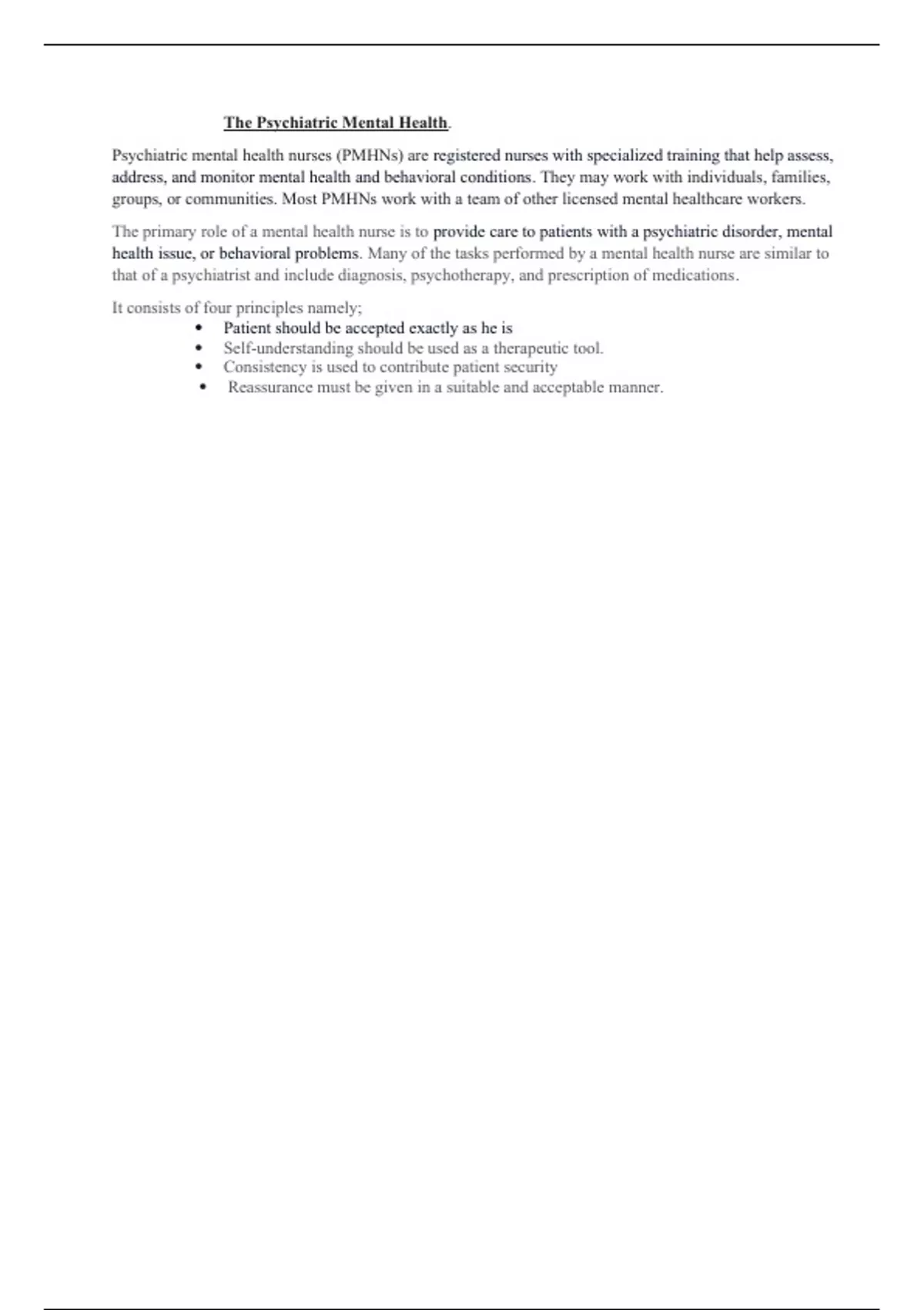 The primary role of a mental health nurse is to provide care to patients with a psychiatric disorder, mental