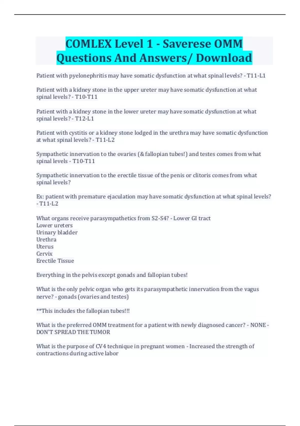 COMLEX Level 1 - Saverese OMM Questions And Answers/ Download