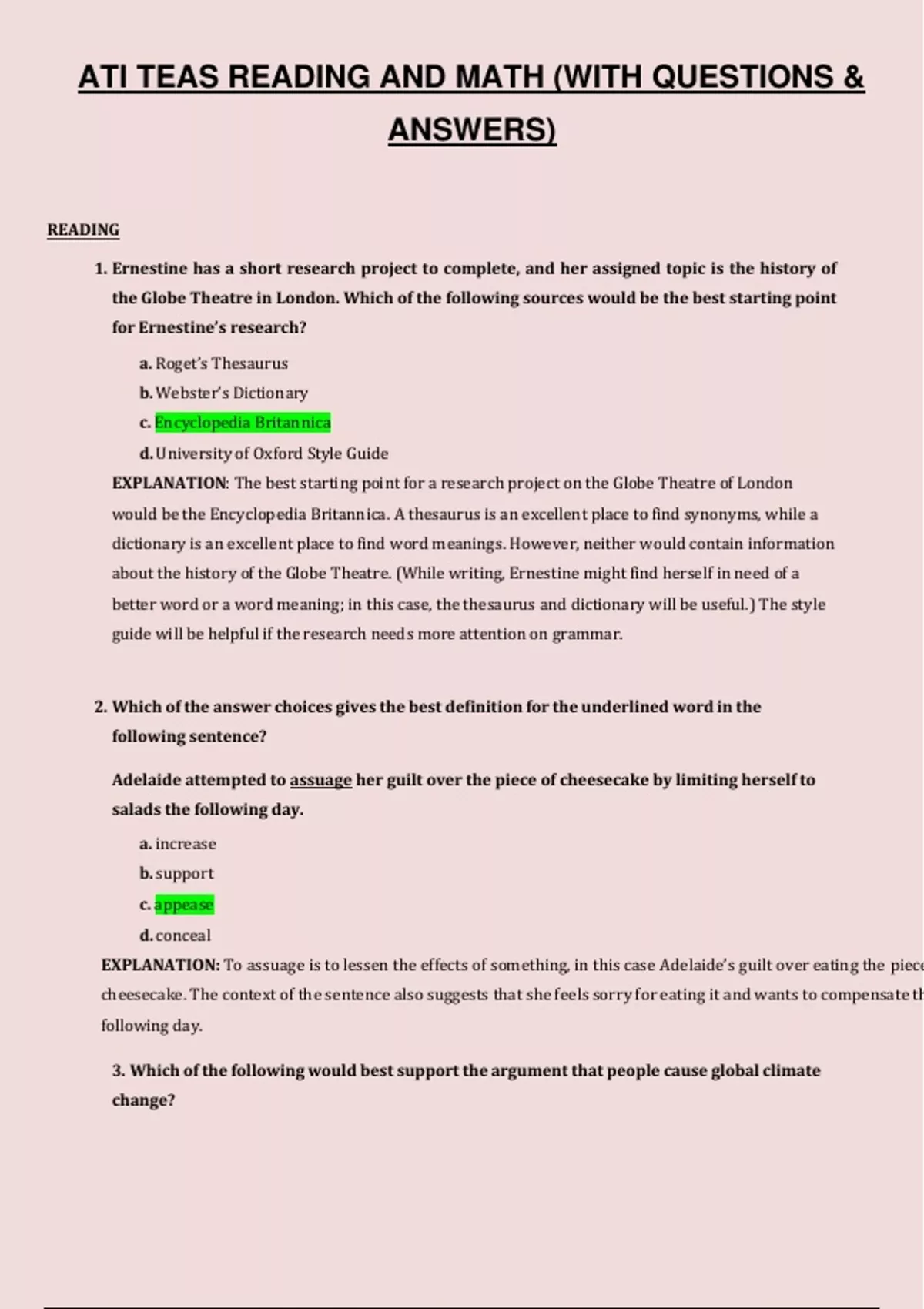 ATI TEAS READING AND MATH (WITH QUESTIONS & ANSWERS)