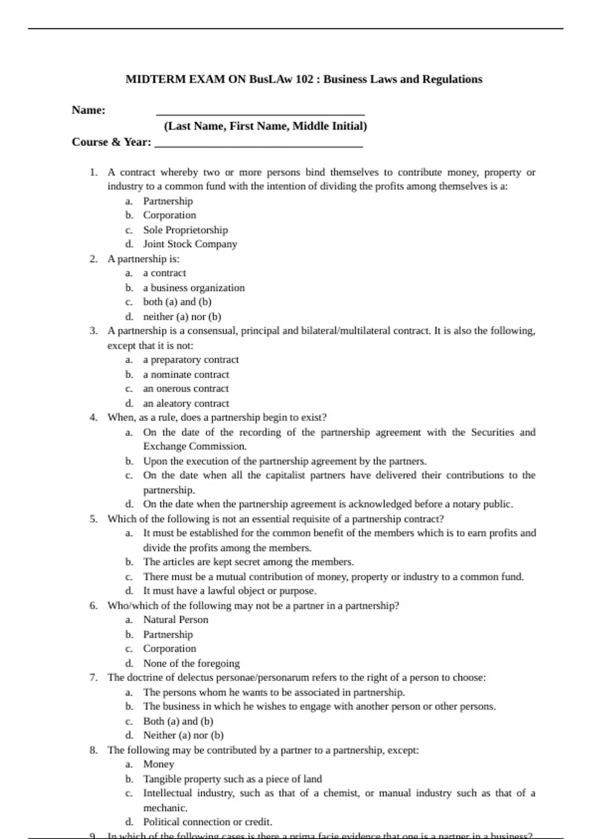 MIDTERM EXAM ON BusLAw 102 Business Laws and Regulations