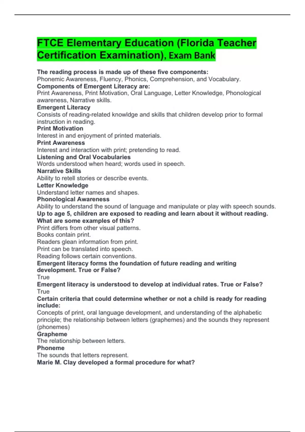 FTCE Elementary Education (Florida Teacher Certification Examination), Exam Bank The reading process is made up of these five components: Phonemic Awareness, Fluency, Phonics, Comprehension, and Vocabulary. Components of Emergent Literacy are: Print Awareness, Print Motivation, Oral Language, Letter Knowledge, Phonological awareness, Narrative skills. Emergent Literacy Consists of reading-related knowldge and skills that children develop prior to formal instruction in reading. Print Motivation Interest in and enjoyment of printed materials. Print Awareness Interest and interaction with print; pretending to read. Listening and Oral Vocabularies Words understood when heard; words used in speech. Narrative Skills Ability to retell stories or describe events. Letter Knowledge Understand letter names and shapes. Phonological Awareness Ability to understand the sound of language and manipulate or play with speech sounds. Up to age 5, children are exposed to reading and learn about it without reading. What are some examples of this? Print differs from other visual patterns. Books contain print. Readers glean information from print. Print can be translated into speech. Reading follows certain conventions. Emergent literacy forms the foundation of future reading and writing development. True or False? True Emergent literacy is understood to develop at individual rates. True or False? True Certain criteria that could determine whether or not a child is ready for reading include: Concepts of print, oral language development, and understanding of the alphabetic principle; the relationship between letters (graphemes) and the sounds they represent (phonemes) Grapheme The relationship between letters. Phoneme The sounds that letters represent. Marie M. Clay developed a formal procedure for what? For observing a child's behavior with bookjs to determine the extent of a child's print-related concepts. Marie M. Clay's formal procedures include assessment checks such as? If the child can: Find the title of a book, show where to start reading and locate the last page or end of the book. A critical pre-reading skill is being able to indicate the directionality of what? Print Readers in the U.S. must start where on the page and read to where? The left side of the page and read to the right. How can teachers or parents model directionality in reading? By passing their hands or fingers under the words or sentences as they read aloud. What four dimensions does language have? Speaking, listening, reading, and writing Oral language is the subset of what? Language Oral language has two dimensions, which are: Speaking and listening Listening is the precursor to what? Speaking Children have to _____________ language before they can speak it. Hear Why is oral language important? It provides the mental framework for what words mean and how language works. 1 Oral language starts where? At home What did Hart and Risley investigate in the way of socio/econmic status level? The number and kind of words children heard in terms of their SES. What are the components of oral language? Phonological awareness, semantic understanding, syntactic understanding, and pragmatics. Phonological Awareness A broad understanding of the sound of language and occurs as children begin to hear speech sounds and play with them. Semantic Understanding Understanding the morphology or meanings of words: vocabulary. Syntactic Understanding Understanding the rules for using words in sentences: grammar. Pragmatics Understanding the social and cultural use of langauge. Phonological awareness sub-skills include: Children should be able to distinguish between spoken language from other environmental sounds and focusing on the structure of syllables in words and onset/rime tasks. What happens next when children increase their phonological awareness? They begin to develop their phonemic awareness. How is a phoneme represented? As a letter within slashes (i.e. /b/) Phonemic Isolation Recognition of individual sounds. (What is the first sound in top?) Phonemic Identification Recognition of the same sounds. (What sound is the same in these words? top, ten, tall) Phonemic Categorization Recognition of similar sounds and choosing the different sound. (Which word doesn't beleong? dip, dime, sun) Phonemic Addition / Subtraction Making a new word by adding or subtracting a phoneme. (What word is "stop" without /s/? What word do you get if you add /s/ to the beginning of "top"?) Phonemic Blending Combining phonemes into a word. (What word is /c/ /a/ /t/? ) Phonemic Segmentation Breaking words into separte phonems. (how many sounds are in stop?) Phonemic Substitution Replacing one phoneme with another to make a new word. (What word is formed if the /t/ in tap is replaced with /m/?) When children understand how oral language works, what do they begin to connect? They begin to connect that knowledge to print. Shared reading can help children gain what? It can help children gain an understanding that printed words represent speech. Alphabet knowledge involves understanding what? The relationship between letters and sounds. Alphabetic Principle The understanding that written words are composed of letters and that groups of letters represenet the sounds of spoken words. How many phonemes are in the English Language? 44 The English alphabet has how many letters? 26 There is an exact one-to-one correspondence between letters and sounds. True or False? False. Alphabet knowledge is a precursor to what? Decoding. Decoding is the application of the alphabetic principle to correctly say or read written words with understanding. True or False? True Phonics Application of the alphabetical principle; using letter/sounds relationships. Analogical Word Reasoning Use of words with the same onset of rime as examples. Syllabication Breaking words into syllables. Morphemic Awareness Dividing words into units of meaning. Ease of decoding contripbutes to comprehension. True or False? Tru