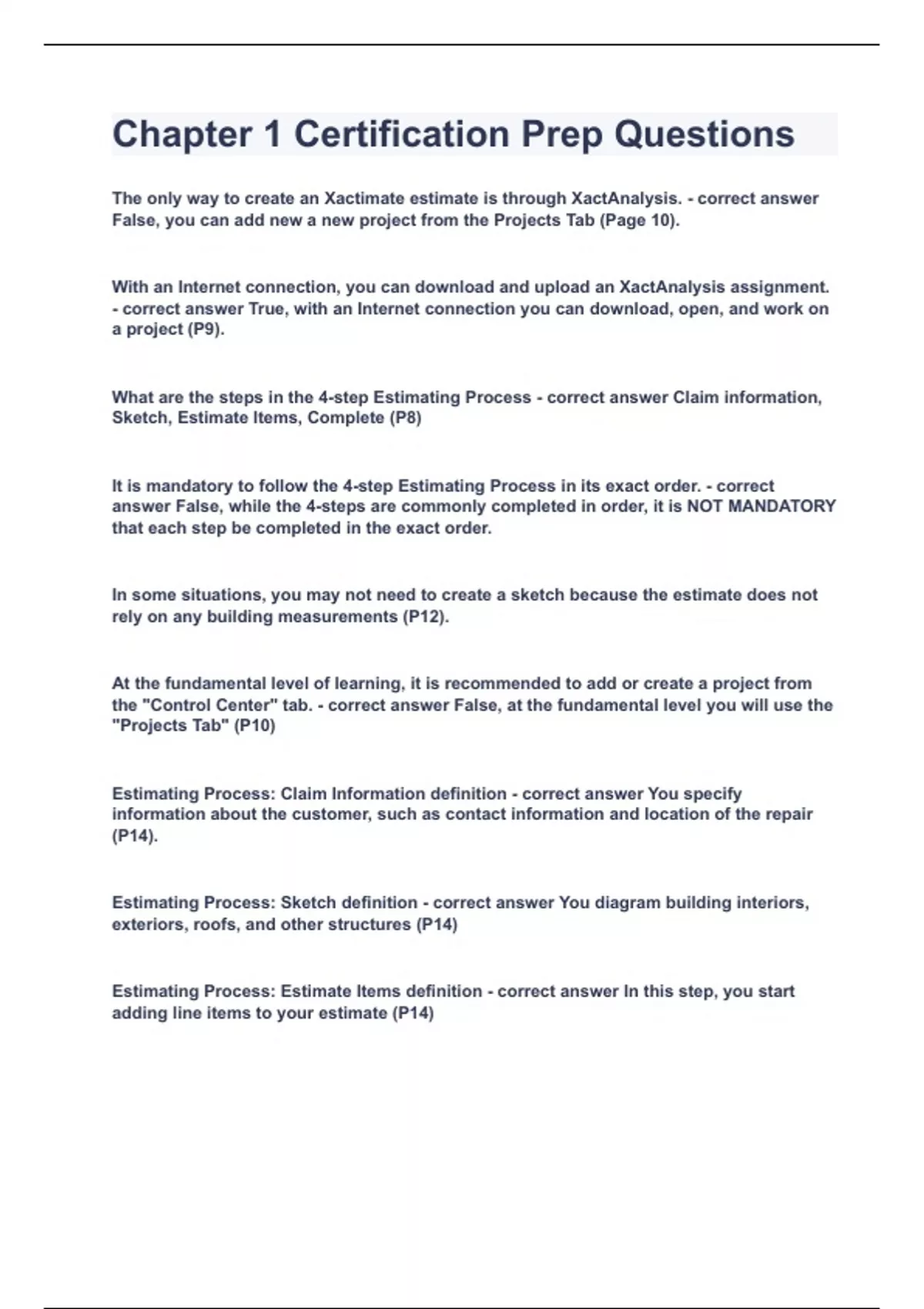 The only way to create an Xactimate estimate is through XactAnalysis. False, you can add new a new project from the Projects Tab (Page 10). With an Internet connection, you can download and upload an XactAnalysis assignment. True, with an Internet connection you can download, open, and work on a project (P9). What are the steps in the 4-step Estimating Process Claim information, Sketch, Estimate Items, Complete (P8) It is mandatory to follow the 4-step Estimating Process in its exact order. False, while the 4-steps are commonly completed in order, it is NOT MANDATORY that each step be completed in the exact order. In some situations, you may not need to create a sketch because the estimate does not rely on any building measurements (P12). At the fundamental level of learning, it is recommended to add or create a project from the "Control Center" tab. False, at the fundamental level you will use the "Projects Tab" (P10) Estimating Process: Claim Information definition You specify information about the customer, such as contact information and location of the repair (P14). Estimating Process: Sketch definition You diagram building interiors, exteriors, roofs, and other structures (P14) Estimating Process: Estimate Items definition In this step, you start adding line items to your