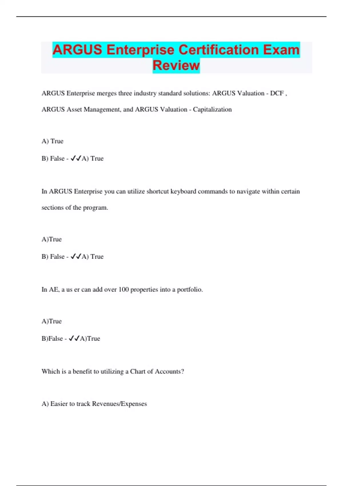 ARGUS Enterprise merges three industry standard solutions: ARGUS Valuation - DCF , ARGUS Asset Management, and ARGUS Valuation - Capitalization A) True B) False - A) True In ARGUS Enterprise you can utilize shortcut keyboard commands to navigate within certain sections of the program. A)True B) False - A) True In AE, a us er can add over 100 properties into a portfolio. A)True B)False - A)True Which is a benefit to utilizing a Chart of Accounts? A) Easier to track Revenues/Expenses