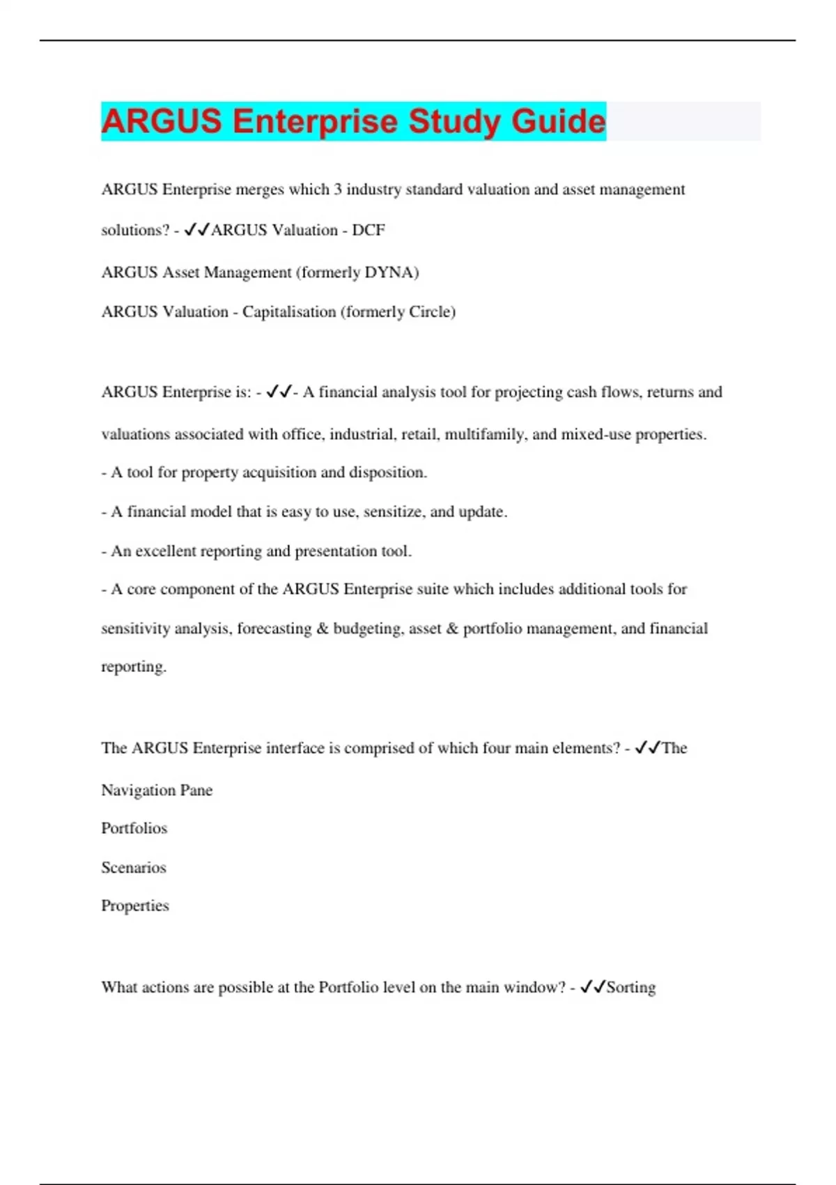 ARGUS Enterprise Study Guide | 125 Questions with 100% Correct Answers | Updated & Verified | 30 Pages