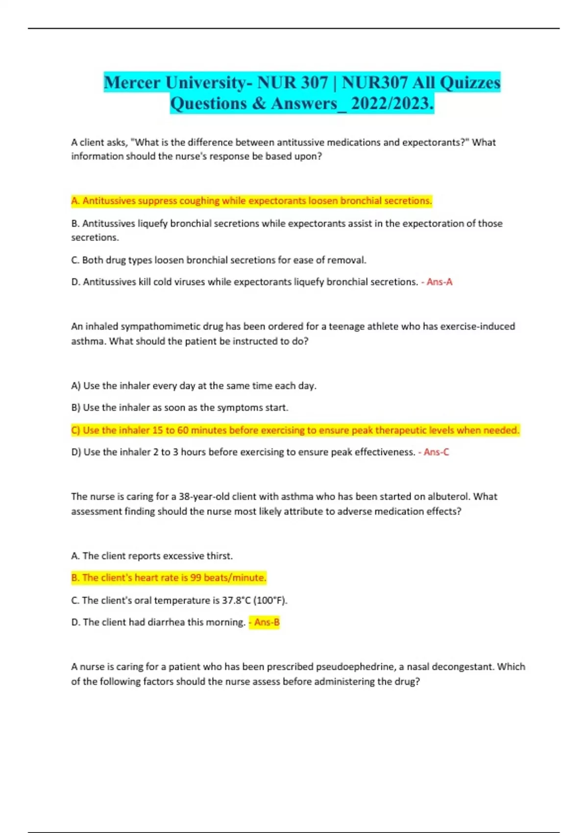 Mercer University- NUR 307 | NUR307 All Quizzes Questions & Answers_ 2022/2023. Document Content and Description Below A client asks, "What is the difference between antitussive medications and expectorants?" What information should the nurse's response be based upon? A. Antitussives suppress coughing while expector ants loosen bronchial secretions. B. Antitussives liquefy bronchial secretions while expectorants assist in the expectoration of those secretions. C. Both drug types loosen bronchial secretions for ease of removal. D. Antitussives kill cold viruses while expectorants liquefy bronchial secretions. - Ans-A An inhaled sympathomimetic drug has been ordered for a teenage athlete who has exercise-induced asthma. What should the patient be instructed to do? A) Use the inhaler every day at the same time each day. B) Use the inhaler as soon as the symptoms start. C) Use the inhaler 15 to 60 minutes before exercising to ensure peak therapeutic levels when needed. D) Use the inhaler 2 to 3 hours before exercising to ensure peak effectiveness. - Ans-C The nurse is caring for a 38-year-old client with asthma who has been started on albuterol. What assessment finding should the nurse most likely attribute to adverse medication effects? A. The client reports excessive thirst. B. The client's heart rate is 99 beats/minute. C. The client's oral temperature is 37.8°C (100°F). D. The client had diarrhea this morning. - Ans-B A nurse is caring for a patient who has been prescribed pseudoephedrine, a nasal decongestant. Which of the following factors should the nurse assess before administering the drug?A. Blood pressure B. Motor coordination C. Auditory tests D. Vision - Ans-A Why are inhaled steroids such as ipratropium used to treat asthma and COPD? A. They act locally to improve mobilization of edema B. They act locally to decrease release of inflammatory mediators C. They act locally to decrease histamine release D. They act locally to decrease histamine release - Ans-B A patient is in the clinic to have blood drawn to assess his or her theophylline level. The patient is taking theophylline (Theo-Dur) and appears to being doing well on the drug. He or she reports no problems. What serum level will the nurse expect the patient to have? A) Between 0.5 to 5 mcg/mL B) Between 10 to 20 mcg/mL C) Between 25 to 35 mcg/mL D) Between 40 to 50 mcg/mL - Ans-B A client presents with a dry nonproductive cough. The client is diagnosed with bronchitis, and it has been determined that assistance is needed in timing the spu