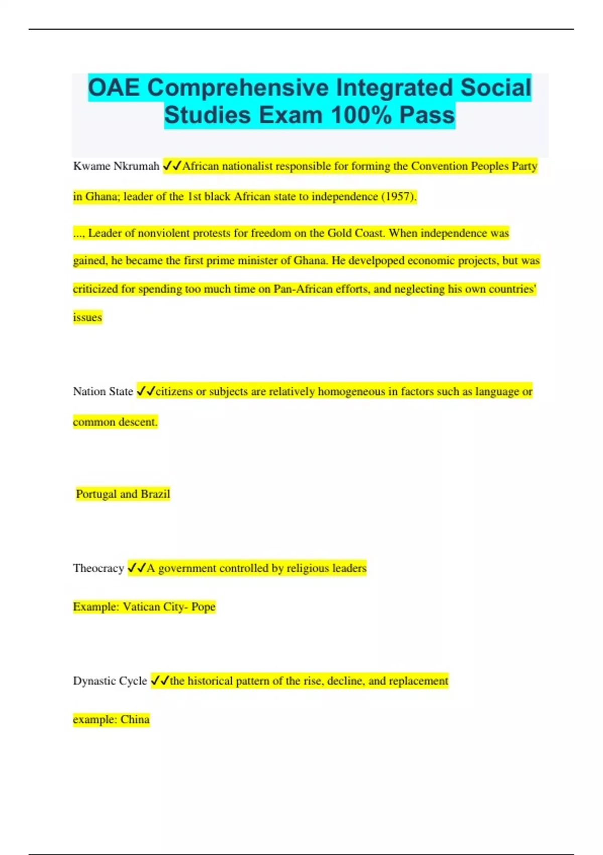 OAE Comprehensive Integrated Social Studies Exam 100% Pass Kwame Nkrumah African nationalist responsible for forming the Convention Peoples Party in Ghana; leader of the 1st black African state to independence (1957). ..., Leader of nonviolent protests for freedom on the Gold Coast. When independence was gained, he became the first prime minister of Ghana. He develpoped economic projects, but was criticized for spending too much time on Pan-African efforts, and neglecting his own countries' issues Nation State citizens or subjects are relatively homogeneous in factors such as language or common descent. Portugal and Brazil Theocracy A government controlled by religious leaders Example: Vatican City- Pope Dynastic Cycle the historical pattern of the rise, decline, and replacement example: China Collectivization Creation of large, state-run farms rather than individual holdings; allowed more efficient control over peasants; part of Stalin's economic and political planning; often adopted in other Communist regimes. Used in U.S.S.R and China. Globalization Actions or processes that involve the entire world and result in making something worldwide in scope Modernization The process of reforming political, military, economic, social, and cultural traditions in imitation of the early success of Western societies, often with regard for accommodating local traditions in non-Western societies. Periodization/Chronology Historian's attempt to break down history into managable segments Fredrick Jackson Turner- Frontier Thesis Historian during the 1890s who wrote _____ which argued that the continuous existence of the American _____ had shaped the character of the nation, and the end of this _____marked the end the first chapter in American history. Charles Beards historian who argued that the Founders were largely motivated by the economic advantage of their class in writing the Constitution Karl Marx . 19th century philosopher, political economist, sociologist, humanist, political theorist, and revolutionary. Often recognized as the father of communism. Analysis of history led to his belief that communism would replace capitalism as it replaced feudalism. Believed in a classless society. European Industrialization shook peasantry loose from ancient habits and customary occupations; many unemployed; drained out of countryside into cities; immigration to America was a by-product of urbanization in Europe Neolithic Revolution (10,000 - 8,000 BCE) The development of agriculture and the domestication of animals as a food source. This led to the development of permanent settlements and the start of civilization. Human civilization born 8000 years in the fertile crescent. Grain cultivation. agriculture, long distance trade, urbanism. social differentiation A process in which people are set apart for differential treatment by virtue of their statuses, roles, and other social characteristics