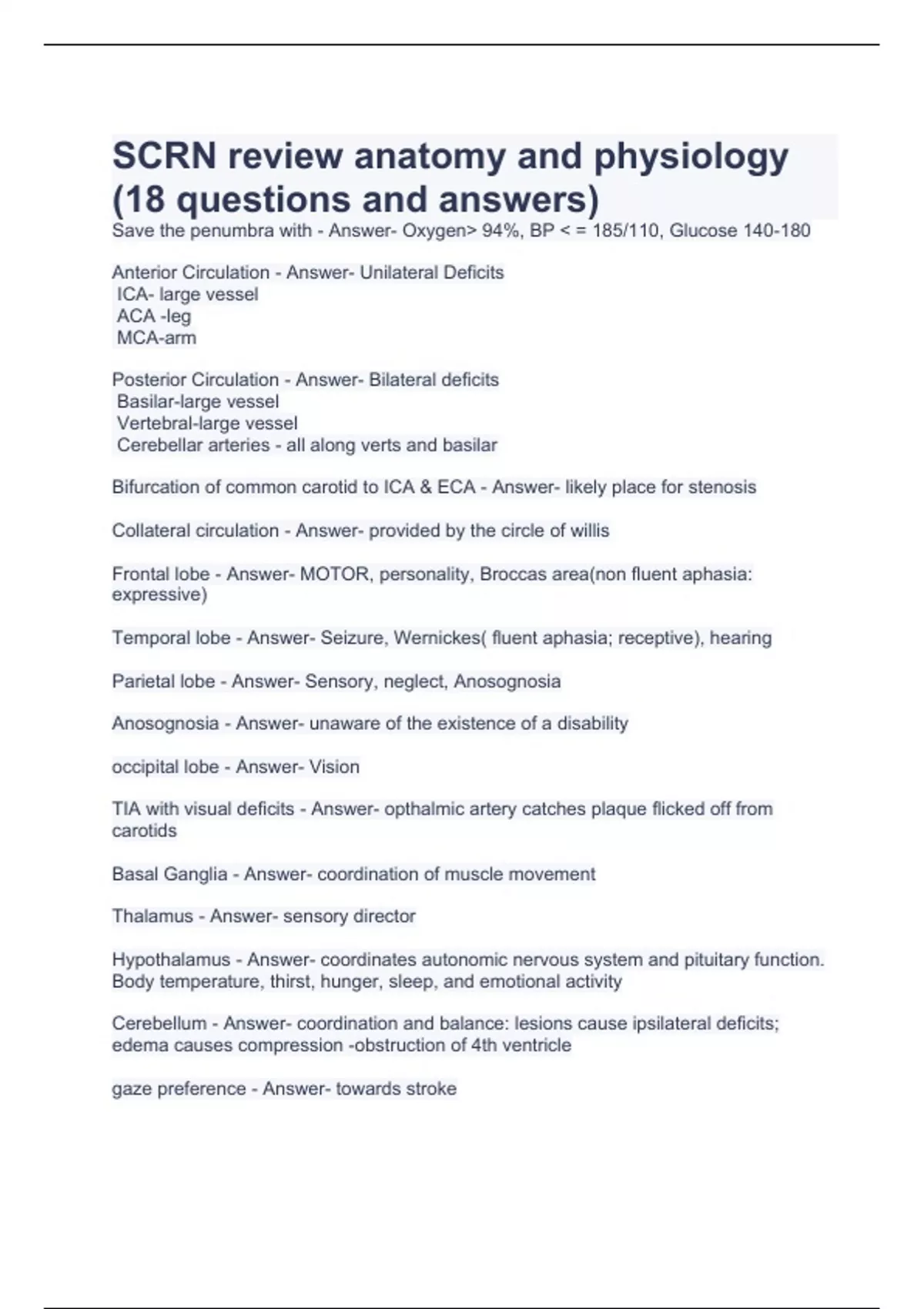 Save the penumbra with - Answer- Oxygen> 94%, BP < = 185/110, Glucose 140-180 Anterior Circulation - Answer- Unilateral Deficits ICA- large vessel ACA -leg MCA-arm Posterior Circulation - Answer- Bilateral deficits Basilar-large vessel Vertebral-large vessel Cerebellar arteries - all along verts and basilar Bifurcation of common carotid to ICA & ECA - Answer- likely place for stenosis Collateral circulation - Answer- provided by the circle of willis Frontal lobe - Answer- MOTOR, personality, Broccas area(non fluent aphasia: expressive) Temporal lobe - Answer- Seizure, Wernickes( fluent aphasia; receptive), hearing Parietal lobe - Answer- Sensory, neglect, Anosognosia Anosognosia - Answer- unaware of the existence of a disability occipital lobe - Answer- Vision TIA with visual deficits - Answer- opthalmic artery catches plaque flicked off from carotids Basal Ganglia - Answer- coordination of muscle movement Thalamus - Answer- sensory director Hypothalamus - Answer- coordinates autonomic nervous system and pituitary function. Body temperature, thirst, hunger, sleep, and emotional activity Cerebellum - Answer- coordination and balance: lesions cause ipsilateral deficits; edema causes compression -obstruction of 4th ventricle gaze preference - Answer- towards stroke Infarction of the pons - Answer- Locked in syndrome- total paralysis below the level of the nucleus of the 3rd nerve, able to open eyes, follow commands with eyes, NO MOTOR MOVEMENT Stroke Syndromes Left (dominant Hemisphere) - Answer- Left gaze preference, right hononomous hemianopia, right hemiparesis- plegia, right hemisensory loss, aphasia Stroke Syndromes Right (non-dominant hemisphere) - Answer- right gaze preference, Left hononomous hemianopia, left hemiparesis/plegia, let sided neglect, left hemisensory loss Stroke Syndromes Brain stem - Answer- Decreased LOC (RAS), diplopia, dysconjugate gaze, gaze palsy, hemiparesis or quadriplegia, dysarthria, dysphagia, vertigo, tinnitus, N/V, Hiccups, abnormal respiration's Stroke Syndromes Medulla - Answer- Wallenburg- nystagmus, Horner's sign, facial sensory loss, pain and temp loss Horner's sign - Answer- ptosis, miosis, anhidrosis ICH - Answer- change in LOC, sleepy, decreased eye opening, focal deficits r/t location of the blood, HA, NV