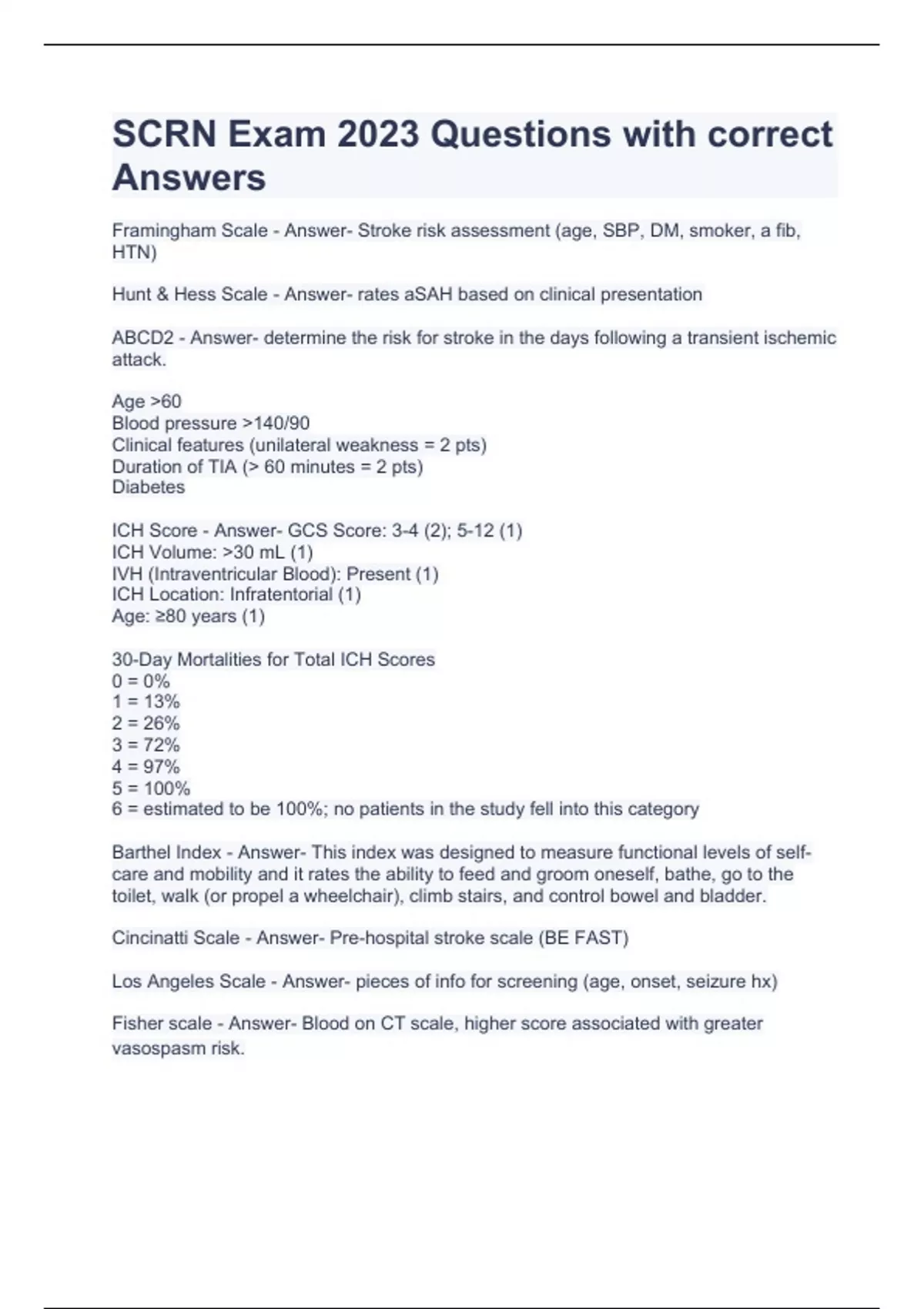 Framingham Scale - Answer- Stroke risk assessment (age, SBP, DM, smoker, a fib, HTN) Hunt & Hess Scale - Answer- rates aSAH based on clinical presentation ABCD2 - Answer- determine the risk for stroke in the days following a transient ischemic attack. Age >60 Blood pressure >140/90 Clinical features (unilateral weakness = 2 pts) Duration of TIA (> 60 minutes = 2 pts) Diabetes ICH Score - Answer- GCS Score: 3-4 (2); 5-12 (1) ICH Volume: >30 mL (1) IVH (Intraventricular Blood): Present (1) ICH Location: Infratentorial (1) Age: ≥80 years (1) 30-Day Mortalities for Total ICH Scores 0 = 0% 1 = 13% 2 = 26% 3 = 72% 4 = 97% 5 = 100% 6 = estimated to be 100%; no patients in the study fell into this category Barthel Index - Answer- This index was designed to measure functional levels of self-care and mobility and it rates the ability to feed and groom oneself, bathe, go to the toilet, walk (or prope