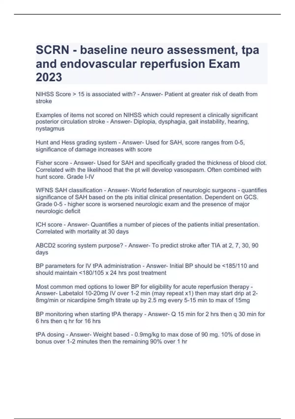 SCRN - baseline neuro assessment, tpa and endovascular reperfusion Exam 2023