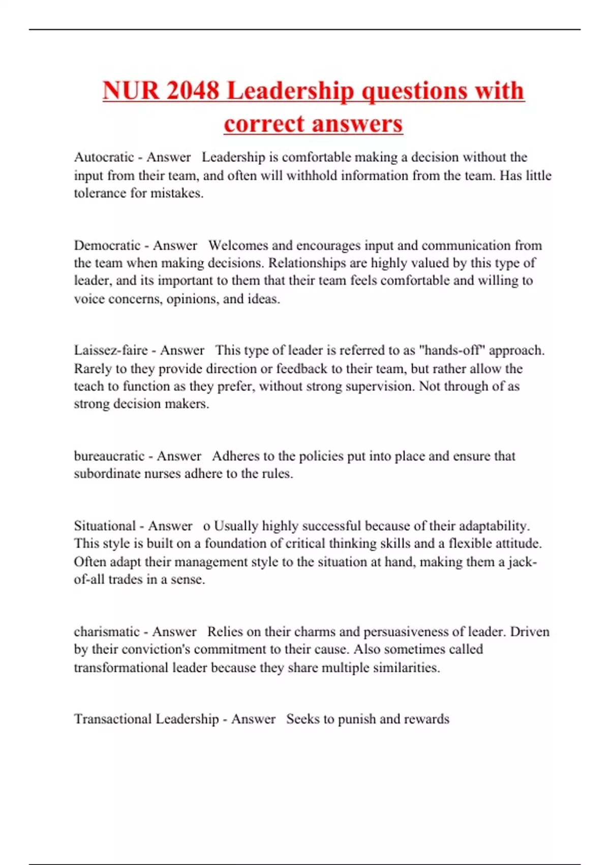 Autocratic - Answer Leadership is comfortable making a decision without the input from their team, and often will withhold information from the team. Has little tolerance for mistakes. Democratic - Answer Welcomes and encourages input and communication from the team when making decisions. Relationships are highly valued by this type of leader, and its important to them that their team feels comfortable and willing to voice concerns, opinions, and ideas. Laissez-faire - Answer This type of leader is referred to as "hands-off" approach. Rarely to they provide direction or feedback to their team, but rather allow the teach to function as they prefer, without strong supervision. Not through of as strong decision makers. bureaucratic - Answer Adheres to the policies put into place and ensure that subordinate nurses adhere to the rules. Situational - Answer o Usually highly successful because of their adaptability. This style is built on a foundation of critical thinking skills and a flexible attitude. Often adapt their management style to the situation at hand, making them a jack-of-all trades in a sense. charismatic - Answer Relies on their charms and persuasiveness of leader. Driven by their conviction's commitment to their cause. Also sometimes called transformational leader because they share multiple similarities. Transactional Leadership - Answer Seeks to punish
