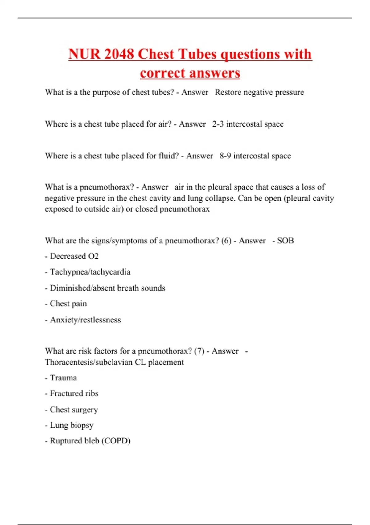 What is a the purpose of chest tubes? - Answer Restore negative pressure Where is a chest tube placed for air? - Answer 2-3 intercostal space Where is a chest tube placed for fluid? - Answer 8-9 intercostal space What is a pneumothorax? - Answer air in the pleural space that causes a loss of negative pressure in the chest cavity and lung collapse. Can be open (pleural cavity exposed to outside air) or closed pneumothorax What are the signs/symptoms of a pneumothorax? (6) - Answer - SOB - Decreased O2 - Tachypnea/tachycardia - Diminished/absent breath sounds - Chest pain - Anxiety/restlessness What are risk factors for a pneumothorax? (7) - Answer - Thoracentesis/subclavian CL placement - Trauma - Fractured ribs - Chest surgery - Lung biopsy - Ruptured bleb (COPD) - Spontaneous