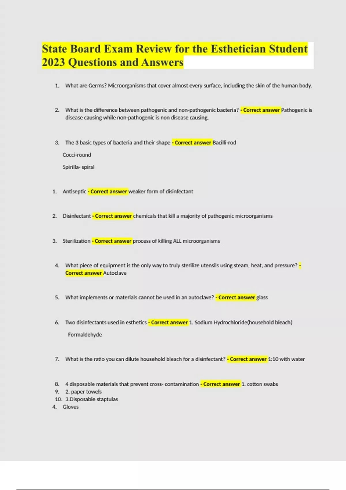 State Board Exam Review for the Esthetician Student 2023 Questions and Answers