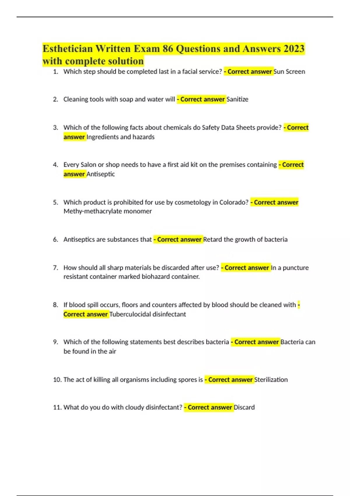 Esthetician Written Exam 86 Questions and Answers 2023 with complete solution