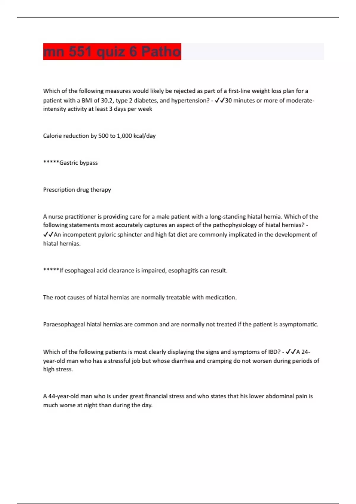Which of the following measures would likely be rejected as part of a first-line weight loss plan for a patient with a BMI of 30.2, type 2 diabetes, and hypertension? - 30 minutes or more of moderateintensity activity at least 3 days per week Calorie reduction by 500 to 1,000 kcal/day *****Gastric bypass Prescription drug therapy A nurse practitioner is providing care for a male patient with a long-standing hiatal hernia. Which of the following statements most accurately captures an aspect of the pathophysiology of hiatal hernias? - An incompetent pyloric sphincter and high fat diet are commonly implicated in the development of hiatal hernias. *****If esophageal acid clearance is impaired, esophagitis can result. The root causes of hiatal hernias are normally treatable with medication. Paraesophageal hiatal hernias are common and are normally not treated if the patient is asymptomatic. Which of the following patients is most clearly displaying the signs and symptoms of IBD? - A 24- year-old man who has a stressful job but whose diarrhea and cramping do not worsen during periods of high stress. A 44-year-old man who is under great financial stress and who states that his lower abdominal pain is much worse at night than during the day.