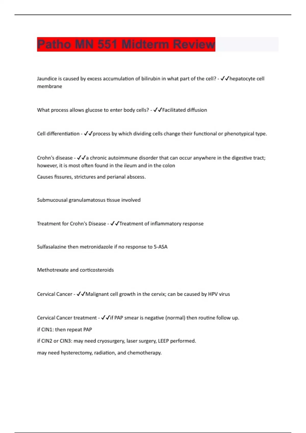 Jaundice is caused by excess accumulation of bilirubin in what part of the cell? - hepatocyte cell membrane What process allows glucose to enter body cells? - Facilitated diffusion Cell differentiation - process by which dividing cells change their functional or phenotypical type. Crohn's disease - a chronic autoimmune disorder that can occur anywhere in the digestive tract; however, it is most often found in the ileum and in the colon Causes fissures, strictures and perianal abscess. Submucousal granulamatosus tissue involved Treatment for Crohn's Disease - Treatment of inflammatory response Sulfasalazine then metronidazole if no response to 5-ASA Methotrexate and corticosteroids Cervical Cancer - Malignant cell growth in the cervix; can be caused by HPV virus Cervical Cancer treatment - if PAP smear is negative (normal) then routine follow up. if CIN1: then repeat PAP if CIN2 or CIN3: may need cryosurgery, laser surgery, LEEP performed. may need hysterectomy, radiation, and chemotherapy.