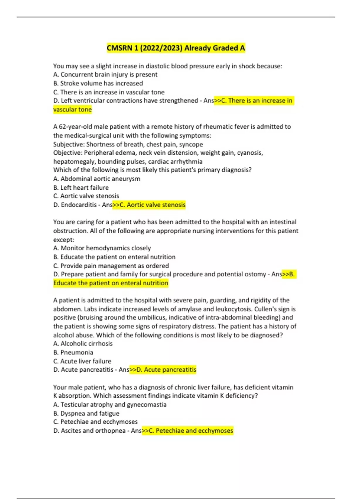 You may see a slight increase in diastolic blood pressure early in shock because: A. Concurrent brain injury is present B. Stroke volume has increased C. There is an increase in vascular tone D. Left ventricular contractions have strengthened - Ans>>C. There is an increase in vascular tone A 62-year-old male patient with a remote history of rheumatic fever is admitted to the medical-surgical unit with the following symptoms: Subjective: Shortness of breath, chest pain, syncope Objective: Peripheral edema, neck vein distension, weight gain, cyanosis, hepatomegaly, bounding pulses, cardiac arrhythmia Which of the following is most likely this patient's primary diagnosis? A. Abdominal aortic aneurysm B. Left heart failure C. Aortic valve stenosis D. Endocarditis - Ans>>C. Aortic valve stenosis You are caring for a patient who has been admitted to the hospital with an intestinal obstruction. All of the following are appropriate nursing interventions for this patient except: A. Monitor hemodynamics closely B. Educate the patient on enteral nutrition C. Provide pain management as ordered D. Prepare patient and family for surgical procedure and potential ostomy - Ans>>B. Educate the patient on enteral nutrition A patient is admitted to the hospital with severe pain, guarding, and rigidity of the abdomen. Labs indicate increased levels of amylase and leukocytosis. Cullen's sign is positive (bruising around the umbilicus, indicative of intra-abdominal bleeding) and the patient is showing some signs of respiratory distress. The patient has a history of alcohol abuse. Which of the following conditions is most likely to be diagnosed? A. Alcoholic cirrhosis B. Pneumonia C. Acute liver failure D. Acute pancreatitis - Ans>>D. Acute pancreatitis Your male patient, who has a diagnosis of chronic liver failure, has deficient vitamin K absorption. Which assessment findings indicate vitamin K deficiency? A. Testicular atrophy and gynecomastia B. Dyspnea and fatigue C. Petechiae and ecchymoses D. Ascites and orthopnea - Ans>>C. Petechiae and ecchymoses
