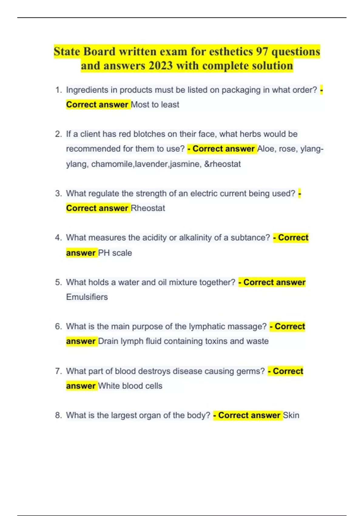 State Board written exam for esthetics 97 questions and answers 2023 with complete solutionState Board written exam for esthetics 97 questions and answers 2023 with complete solution