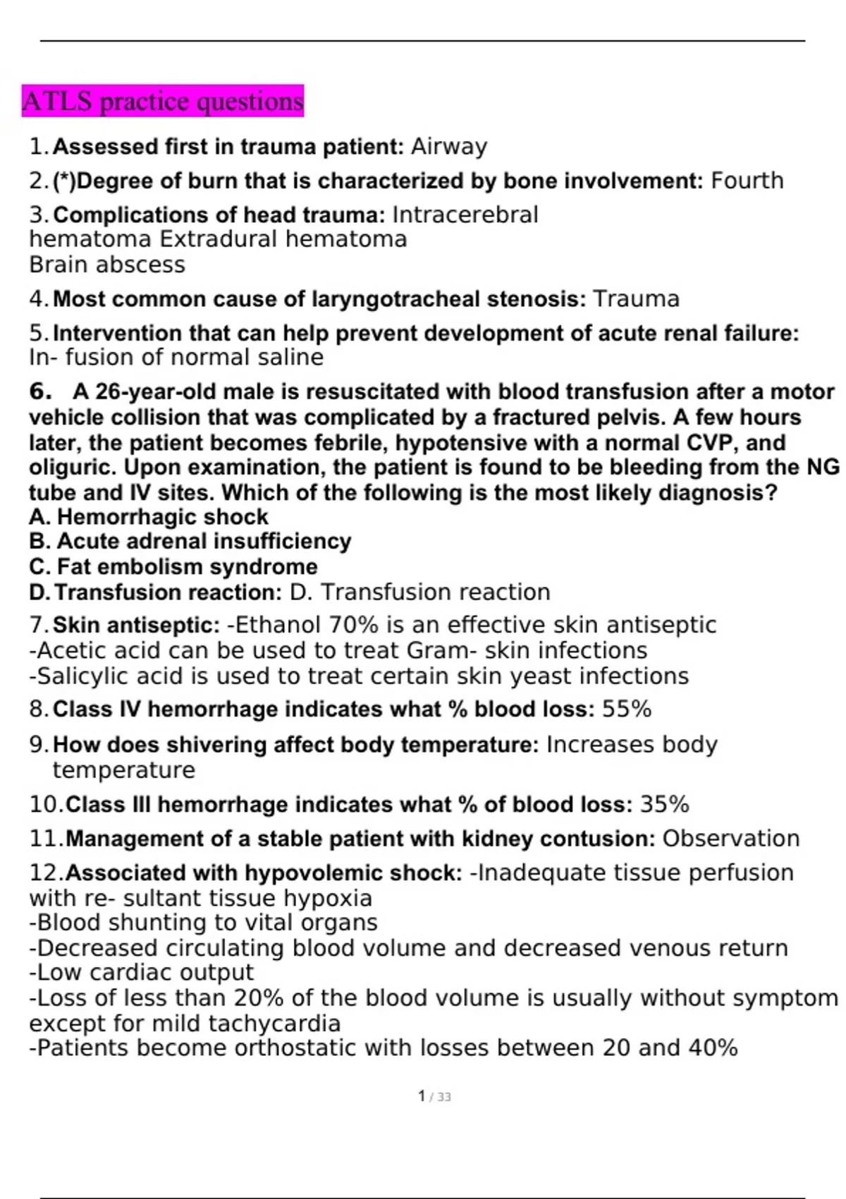 ATLS practice Questions and Answers