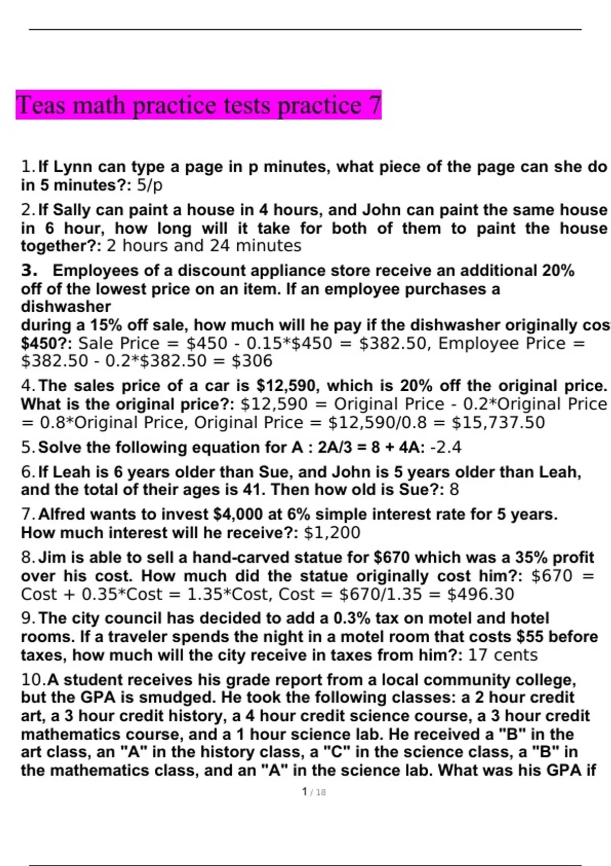 ATI Teas 7 math practice tests