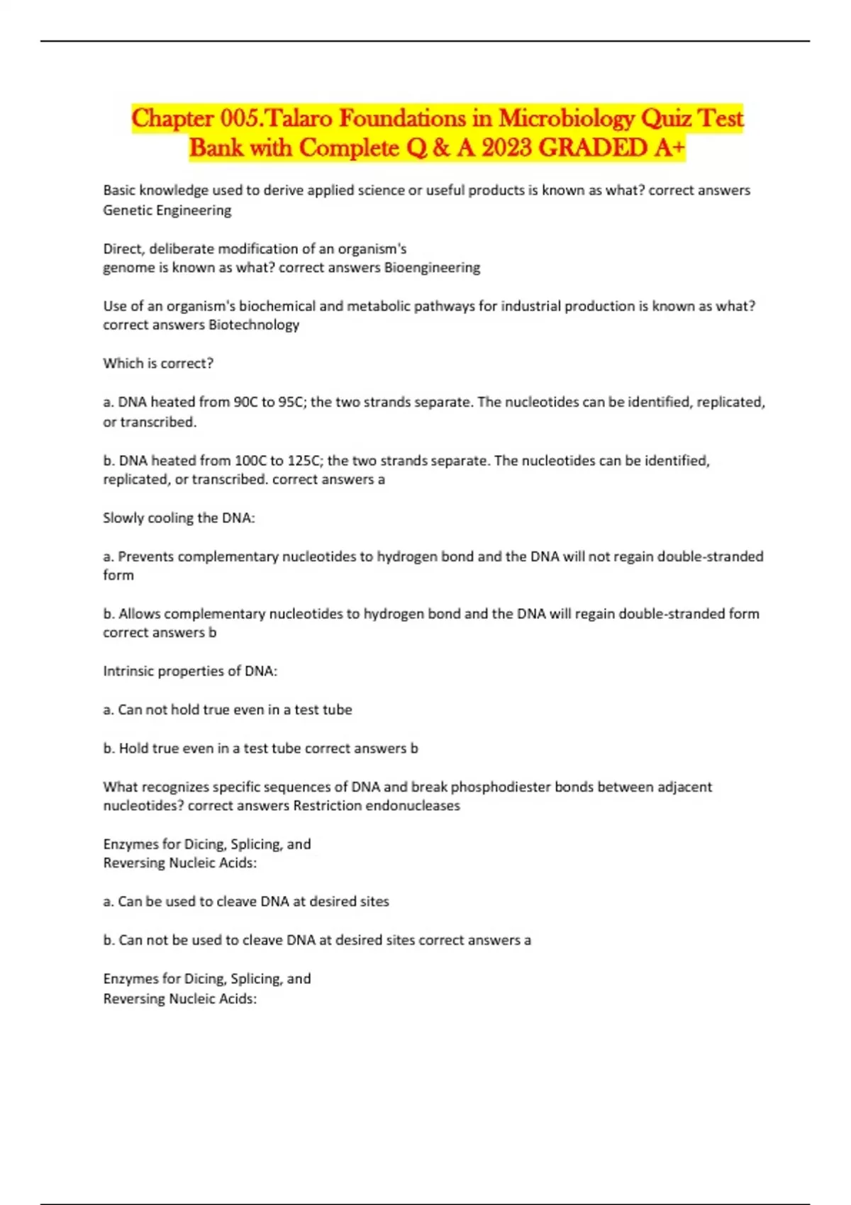 Chapter 005.Talaro Foundations in Microbiology Quiz Test Bank with Complete Q & A 2023 GRADED A+ Basic knowledge used to derive applied science or useful products is known as what? correct answers Genetic Engineering Direct, deliberate modification of an organism's genome is known as what? correct answers Bioengineering Use of an organism's biochemical and metabolic pathways for industrial production is known as what? correct answers Biotechnology Which is correct? a. DNA heated from 90C to 95C; the two strands separate. The nucleotides can be identified, replicated, or transcribed. b. DNA heated from 100C to 125C; the two strands separate. The nucleotides can be identified, replicated, or transcribed. correct answers a Slowly cooling the DNA: a. Prevents complementary nucleotides to hydrogen bond and the DNA will not regain double-stranded form b. Allows complementary nucleotides to hydrogen bond and the DNA will regain double-stranded form correct answers b Intrinsic properties of DNA: a. Can not hold true even in a test tube b. Hold true even in a test tube correct answers b What recognizes specific sequences of DNA and break phosphodiester bonds between adjacent nucleotides? correct answers Restriction endonucleases Enzymes for Dicing, Splicing, and Reversing Nucleic Acids: a. Can be used to cleave DNA at desired sites b. Can not be used to cleave DNA at desired sites correct answers a Enzymes for Dicing, Splicing, and Reversing Nucleic Acids: a. Are unable to Recognize and clip the DNA at palindrome base sequences b. Recognize and clip the DNA at palindrome base sequences correct answers b What is Used in the lab to cut DNA into smaller pieces? correct answers Restriction fragments DNA sequences a. Are the same amongst members of the same species b. Vary, even among members of the same species correct answers b Differences in the cutting pattern of specific restriction endonucleases: a. Give rise to fragments of differing lengths (RFLPs) b. Prevent rise of fragments and their differing lengths (RFLPs) correct answers a What rejoins phosphate-sugar bonds (sticky ends) cut by endonucleases? correct answers Ligase Enzymes for Dicing, Splicing, and Reversing Nucleic Acids are: a. Used for final splicing of genes into plasmids and chromosomes b. Used for final splicing of genes into plasmids and chromosomes correct answers a What makes a DNA copy of RNA cDNA? correct answers Reverse transcriptase cDNA can be made from : a. mRNA, tRNA, or rRNA b. DNA, Protein, And Amino Acids correct answers b