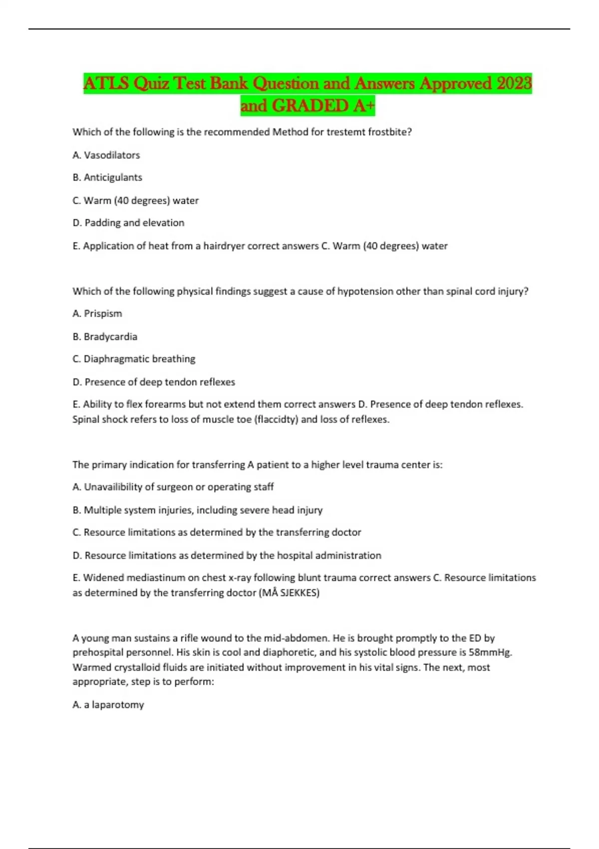 Quiz Test Bank Question and Answers Approved 2023 and GRADED A+ Which of the following is the recommended Method for trestemt frostbite? A. Vasodilators B. Anticigulants C. Warm (40 degrees) water D. Padding and elevation E. Application of heat from a hairdryer correct answers C. Warm (40 degrees) water Which of the following physical findings suggest a cause of hypotension other than spinal cord injury? A. Prispism B. Bradycardia C. Diaphragmatic breathing D. Presence of deep tendon reflexes E. Ability to flex forearms but not extend them correct answers D. Presence of deep tendon reflexes. Spinal shock refers to loss of muscle toe (flaccidty) and loss of reflexes. The primary indication for transferring A patient to a higher level trauma center is: A. Unavailibility of surgeon or operating staff B. Multiple system injuries, including severe head injury C. Resource limitations as determined by the transferring doctor D. Resource limitations as determined by the hospital administration E. Widened mediastinum on chest x-ray following blunt trauma correct answers C. Resource limitations as determined by the transferring doctor (MÅ SJEKKES) A young man sustains a rifle wound to the mid-abdomen. He is brought promptly to the ED by prehospital personnel. His skin is cool and diaphoretic, and his systolic blood pressure is 58mmHg. Warmed crystalloid fluids are initiated without improvement in his vital signs. The next, most appropriate, step is to perform: A. a laparotomy B. An abdominal CT-scan C. Diagnostic laparoscopy D. Abdominal ultrasonography E. A diagnostic peritoneal lavage correct answers A. Laparotomy because of hemodynamic abnormality A 42-year-old man is trapped from the waist down beneath his overturned tractor for several hours before medical assistance arrives. He is awake and alert until just before arriving in the ED. He is now unconscious and responds only to painful stimuli by moaning. His pupils are 3mm in diameter and symmetrically reactive to light. Prehospital personnel indicate that they have not seen the patient move either of his lower extremities. On examination in the ED, no movement of his lower extremities are detected, even in response to painful stimuli. The most likely cause for this finding is: A. An epidural hematoma B. A pelvic fracture C. Central cord syndrome D. Intracerebral hemorrhage E. Bilateral compartment syndrome correct answers MÅ SJEKKES A 6-year-o boy is struck by an automobile and brought to the ED. He is lethargic, but withdraws purposefully from painful stimuli. His blood pressure is 90mmHg systolic, heart rate 140 beats per minute and his respiratory rate is 36 breaths per minute. The preferred route of venous access in this patient is: A. Percutaneous femoral vein cannulation B. Cutdown on the saphenous vein at the ankle C. Intraosseous catheter placement in the proximal tibia D. Percutaneous peripheral veins in the upper extremities E. Central venous access via the subclavian or internal jugular vein correct answers D. Percutaneous peripheral veins in the upper extremities A young man sustains a gunshot wound to the abdomen and is brought promptly to the ED by prehospital personnel. His skin is cool and diaphoretic, and he is confused. His pulse is thready and his femoral pulse is only weakly palpable. The definitive treatment in managing this patient is to: A. Administer O-negative blood B. Apply external warming devices C. Control internal hemorrhage operatively D. Apply a pneumatic antishock garment (PASG) E. Infuse large volumes of intravenous crystalloid solutions. correct answers C. Control internal hemorrhage operatively Regarding shock in the child, which of the following is FALSE? A. Vital signs are age-related B. Children have greater physiologic reserves than do adults C. Tachycardia is the primary physiologic response to hypovolemia D. The absolute volume of blood loss required to produce shock is the same as in adults E. An initial fluid bolus for resuscitation should approximate 20ml/kg Ringers Lactate correct answers D. The absolute volume of blood loss required to produce shock is the same as in adults A 33-year-old man is struck by a car travelling at 56km/h (35mph). He has obvious fractures of the left tibia near the knee, pain in the pelvic area, and severe dyspnea. His heart rate is 182 beats per minute, and his respiratory rate is 48 breaths per minute with no breath sounds heard in the left chest. A tension pneumothorax is relieved by immediate needle decompression and tube thoracostomy. Subsequently, his heart rate decreases to 144 beats per minute, his respirartory rate decreases to 36 breaths per minute and his blood pressure is 81/53 mmHg. Warmed Ringers lactate is adminstered intravenously. The next priority should be to: A. Perform external fixation of the pelvis B. Obtain abdominal and pelvic CT-scans C. Perform arterial embolization of the pelvic vessel D. Perform diagnostic peritoneal lavage or FAST E. Perform a urethrogram and cystogram correct answers D. Perform diagnostic peritoneal lavage or FAST A 42-year-old man, injured in a motor vehicle crash, suffers a closed head injury, multiple palpable left rib fractures, and bilateral femur fractures. He is intubated orotracheally without difficulty. Initially, his ventilations are easily assisted with a bag-mask device. It becomes more difficult to ventilate the patient over the next 5 minutes, and his hemoglobin oxygen saturation level decreases from 98% to 89%. The most appropriate next step is to: A. Obtain a chest x-ray