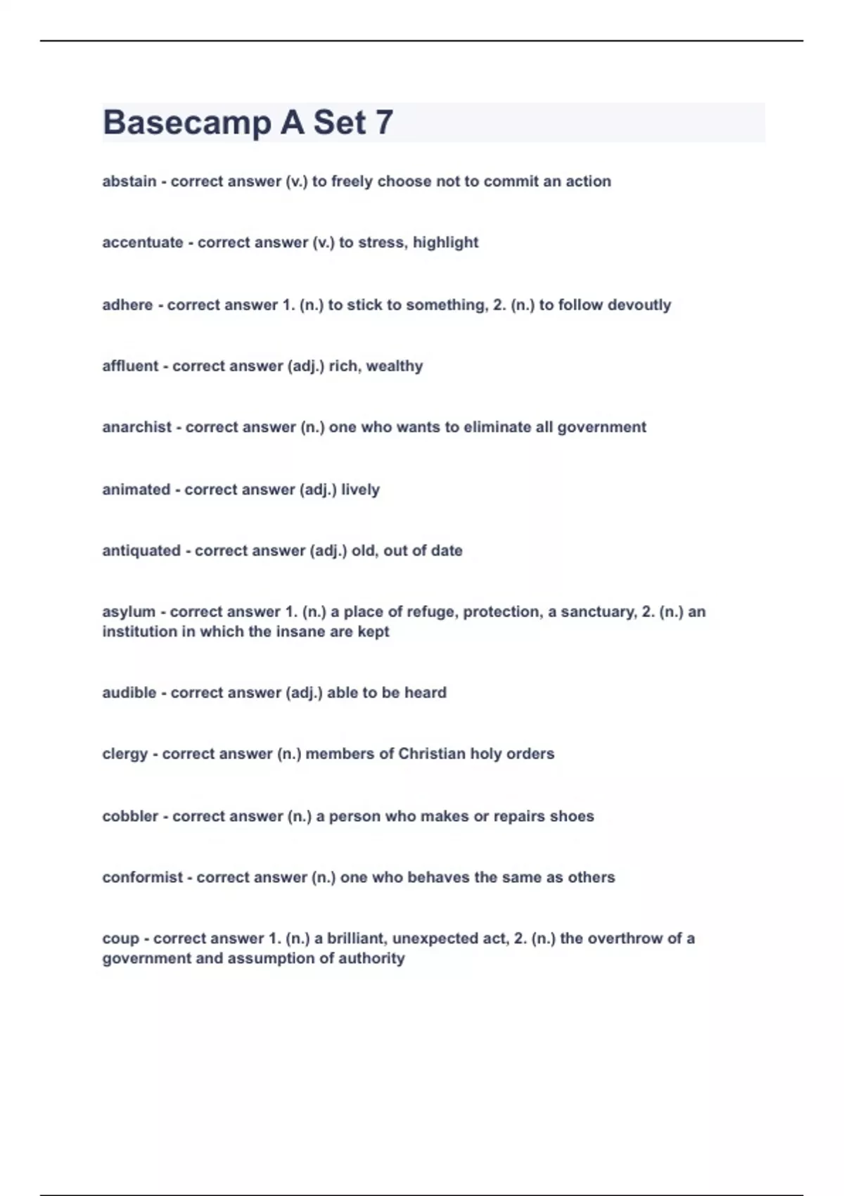 abstain (v.) to freely choose not to commit an action accentuate (v.) to stress, highlight adhere 1. (n.) to stick to something, 2. (n.) to follow devoutly affluent (adj.) rich, wealthy anarchist (n.) one who wants to eliminate all government animated (adj.) lively antiquated (adj.) old, out of date asylum 1. (n.) a place of refuge, protection, a sanctuary, 2. (n.) an institution in which the insane are kept audible (adj.) able to be heard clergy (n.) members of Christian holy orders cobbler (n.) a person who makes or repairs shoes conformist (n.) one who behaves the same as others coup 1. (n.) a brilliant, unexpected act, 2. (n.) the overthrow of a government and assumption of authority deliberate (adj.) intentional, reflecting careful consideration disclose (v.) to reveal, make public divine (adj.) godly, exceedingly wonderful elicit (v.) to bring forth, draw out, evoke elude (v.) to evade, escape extraneous (adj.) irrelevant, extra, not necessary extricate (v.) to disentangle fabricate (v.) to make up, invent figurative (adj.) symbolic frugal (adj.) thrifty, economical