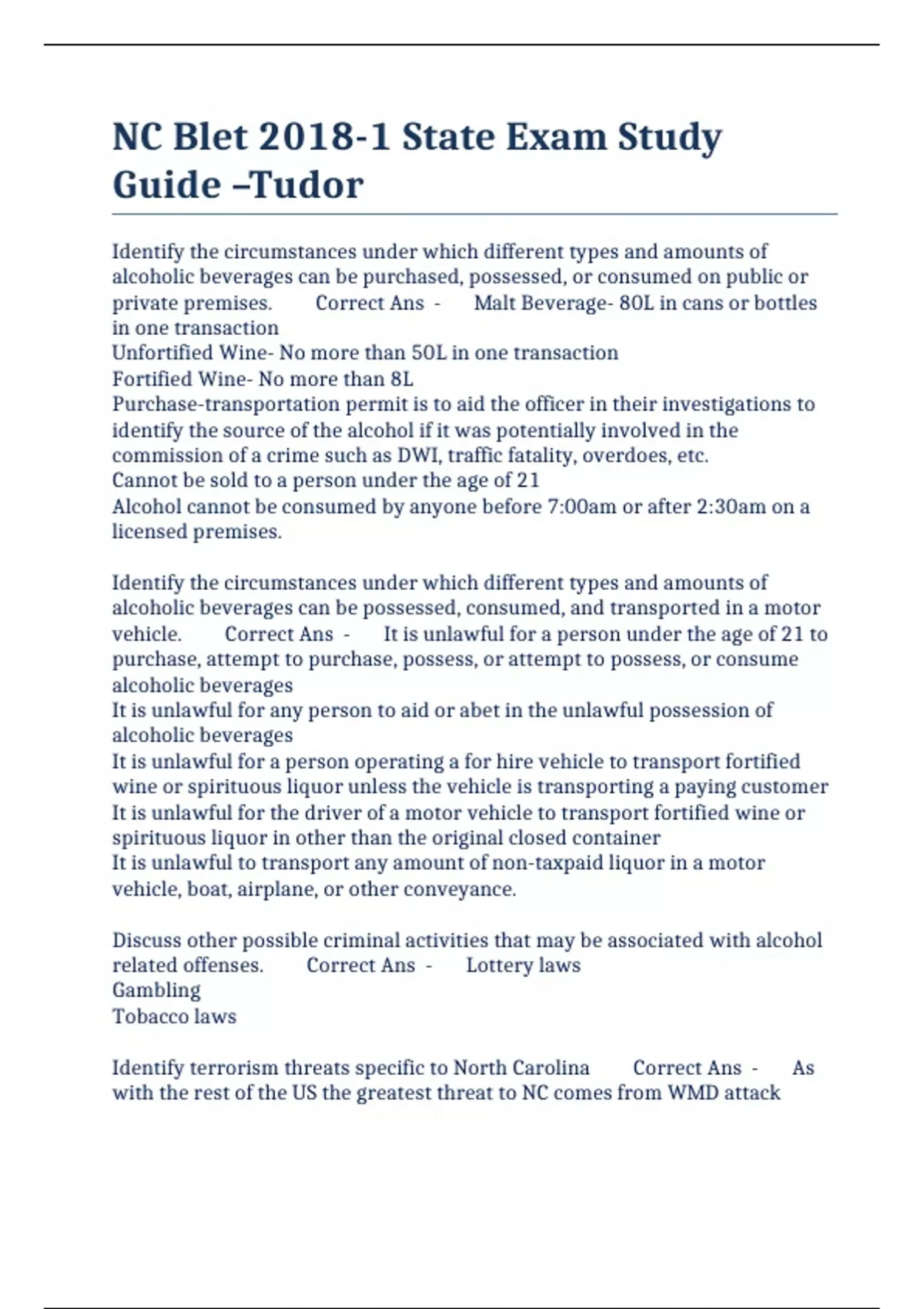 NC Blet 2018-1 State Exam Study Guide –Tudor