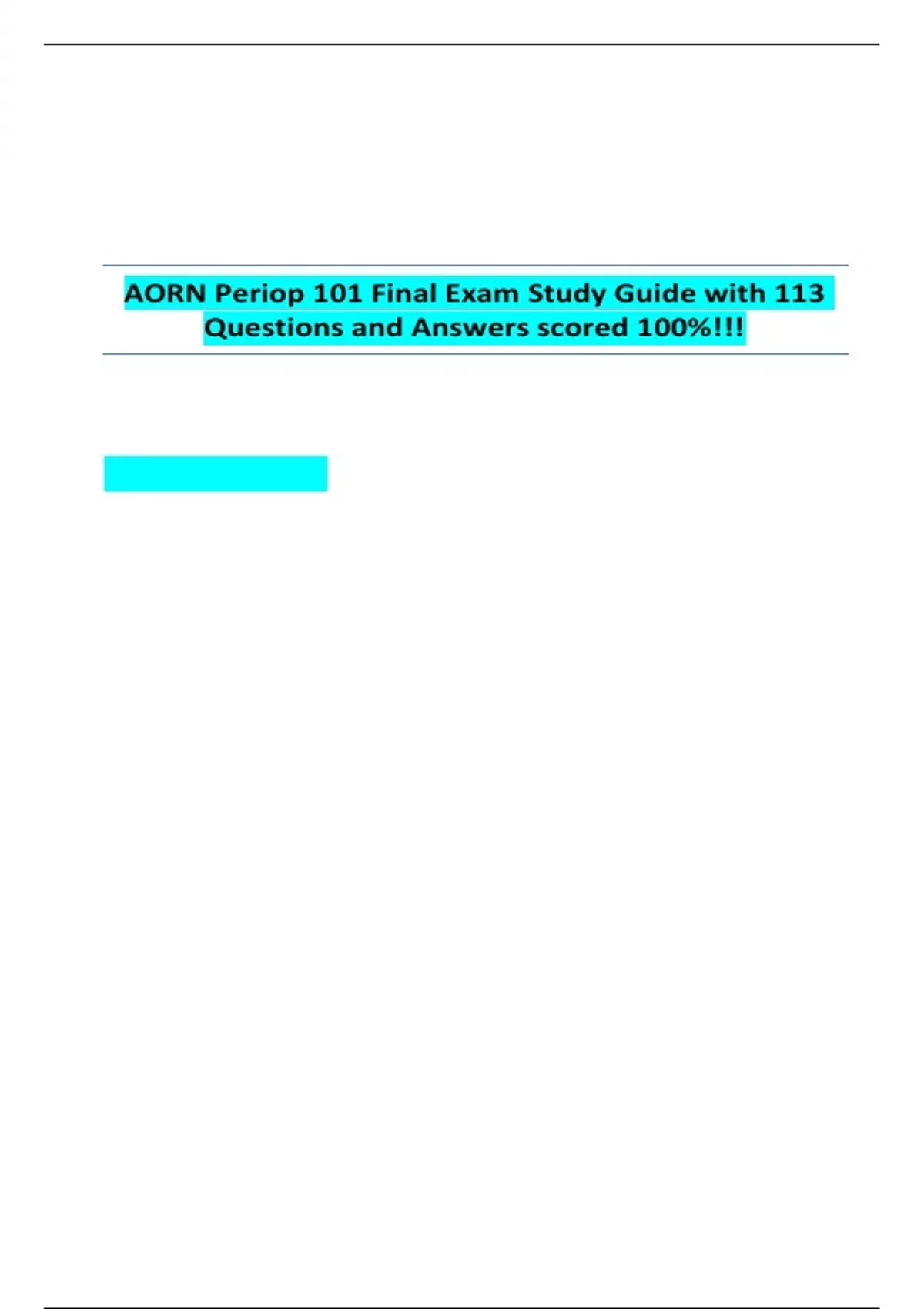 AORN Periop 101 Final Exam Study Guide with 113 Questions and Answers scored 100%!!!1. This type of needle point is what you would expect to be needed for suturing friable tissue such as the liver. Correct ans - What is a Blunt needle point? 2. These particular wound closing items are available in a wide variety of instrument sizes. Correct ans - What are disposable stapler sets? 3. Give one example from TJC list of Do-Not-Use Abbreviations, Acronyms, and Symbols. Correct ans - What is cc? 5.The surgical wound classification for a total abdominal hysterectomy. Correct ans - What is Clean contaminated? 4.Following an excisional breast biopsy, the circulating nurse would anticipate the need to have available this type of drain Correct ans - What is a Jackson-Pratt? 6. This position can cause physiological effects of circulatory and respiratory compromise due to pressure on the abdomen. Correct ans - What is Lithotomy Position? 7. To protect sensitive areas of the skin with appropriate padding is a recommended practice for this: Correct ans - What is to reduce the patient's risk of intraoperative skin injury. 8. An environmental sanitation practice that is required to limit the transmission of microorganisms to personnel when handling body fluid spills Correct ans - What is personal protective equipment? 9. It is recommended to inspect the active electrode for insulation defects to prevent this from occurring during MIS Correct ans - What is capacitive coupling? 10. According to AORN RP for positioning the patient, the perioperative nurse should: What is... a. Use a consistent method of procedure-specific position for each patient b. Rely on the surgeon's and anesthesia provider's assessments to guide positioning