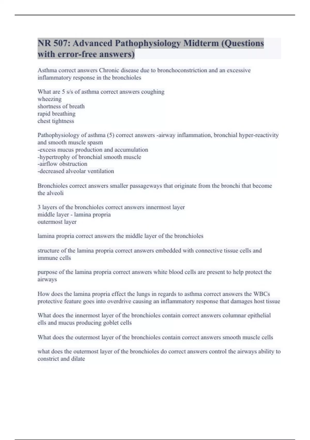 Asthma correct answers Chronic disease due to bronchoconstriction and an excessive inflammatory response in the bronchioles What are 5 s/s of asthma correct answers coughing wheezing shortness of breath rapid breathing chest tightness Pathophysiology of asthma (5) correct answers -airway inflammation, bronchial hyper-reactivity and smooth muscle spasm -excess mucus production and accumulation -hypertrophy of bronchial smooth muscle -airflow obstruction -decreased alveolar ventilation Bronchioles correct answers smaller passageways that originate from the bronchi that become the alveoli 3 layers of the bronchioles correct answers innermost layer middle layer - lamina propria outermost layer lamina propria correct answers the middle layer of the bronchioles structure of the lamina propria correct answers embedded with connective tissue cells and immune cells purpose of the lamina propria correct answers white blood cells are present to help protect the airways How does the lamina propria effect the lungs in regards to asthma correct answers the WBCs protective feature goes into overdrive causing an inflammatory response that damages host tissue What does the innermost layer of the bronchioles contain correct answers columnar epithelial ells and mucus producing goblet cells What does the outermost layer of the bronchioles contain correct answers smooth muscle cells what does the outermost layer of the bronchioles do correct answers control the airways ability to constrict and dilate