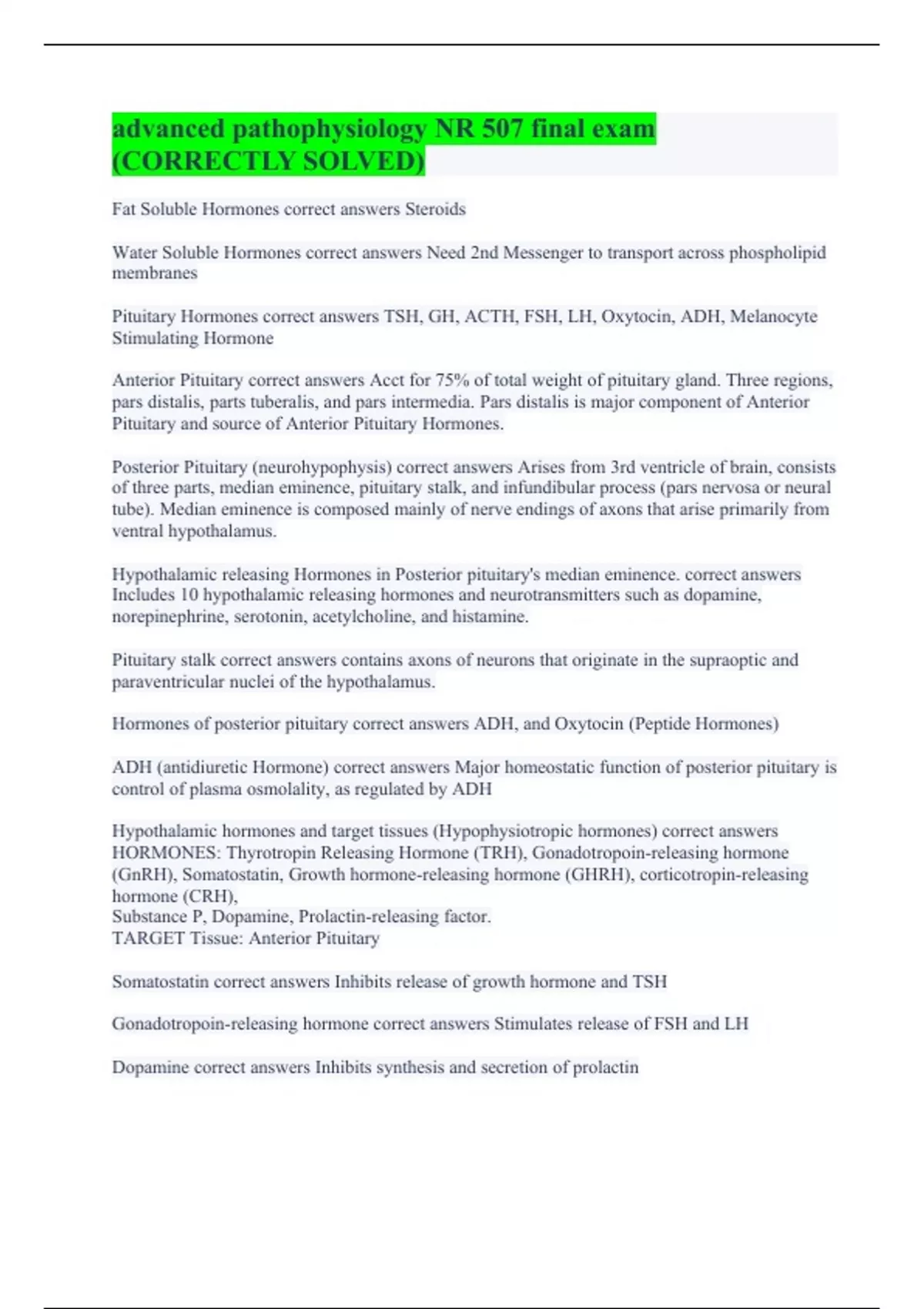 Fat Soluble Hormones correct answers Steroids Water Soluble Hormones correct answers Need 2nd Messenger to transport across phospholipid membranes Pituitary Hormones correct answers TSH, GH, ACTH, FSH, LH, Oxytocin, ADH, Melanocyte Stimulating Hormone Anterior Pituitary correct answers Acct for 75% of total weight of pituitary gland. Three regions, pars distalis, parts tuberalis, and pars intermedia. Pars distalis is major component of Anterior Pituitary and source of Anterior Pituitary Hormones. Posterior Pituitary (neurohypophysis) correct answers Arises from 3rd ventricle of brain, consists of three parts, median eminence, pituitary stalk, and infundibular process (pars nervosa or neural tube). Median eminence is composed mainly of nerve endings of axons that arise primarily from ventral hypothalamus. Hypothalamic releasing Hormones in Posterior pituitary's median eminence. correct answers Includes 10 hypothalamic releasing hormones and neurotransmitters such as dopamine, norepinephrine, serotonin, acetylcholine, and histamine. Pituitary stalk correct answers contains axons of neurons that originate in the supraoptic and paraventricular nuclei of the hypothalamus. Hormones of posterior pituitary correct answers ADH, and Oxytocin (Peptide Hormones) ADH (antidiuretic Hormone) correct answers Major homeostatic function of posterior pituitary is control of plasma osmolality, as regulated by ADH Hypothalamic hormones and target tissues (Hypophysiotropic hormones) correct answers HORMONES: Thyrotropin Releasing Hormone (TRH), Gonadotropoin-releasing hormone (GnRH), Somatostatin, Growth hormone-releasing hormone (GHRH), corticotropin-releasing hormone (CRH), Substance P, Dopamine, Prolactin-releasing factor. TARGET Tissue: Anterior Pituitary Somatostatin correct answers Inhibits release of growth hormone and TSH Gonadotropoin-releasing hormone correct answers Stimulates release of FSH and LH Dopamine correct answers Inhibits synthesis and secretion of prolactin
