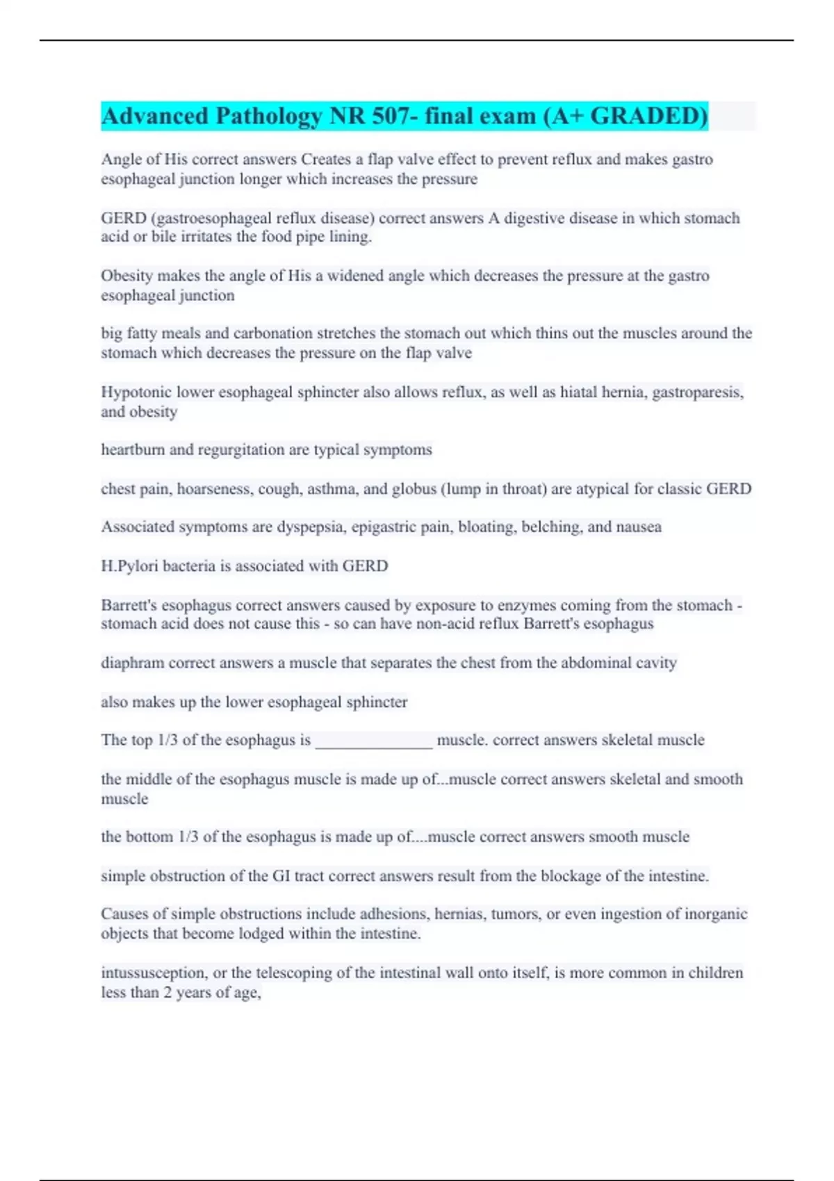 Angle of His correct answers Creates a flap valve effect to prevent reflux and makes gastro esophageal junction longer which increases the pressure GERD (gastroesophageal reflux disease) correct answers A digestive disease in which stomach acid or bile irritates the food pipe lining. Obesity makes the angle of His a widened angle which decreases the pressure at the gastro esophageal junction big fatty meals and carbonation stretches the stomach out which thins out the muscles around the stomach which decreases the pressure on the flap valve Hypotonic lower esophageal sphincter also allows reflux, as well as hiatal hernia, gastroparesis, and obesity heartburn and regurgitation are typical symptoms chest pain, hoarseness, cough, asthma, and globus (lump in throat) are atypical for classic GERD Associated symptoms are dyspepsia, epigastric pain, bloating, belching, and nausea H.Pylori bacteria is associated with GERD Barrett's esophagus correct answers caused by exposure to enzymes coming from the stomach - stomach acid does not cause this - so can have non-acid reflux Barrett's esophagus diaphram correct answers a muscle that separates the chest from the abdominal cavity also makes up the lower esophageal sphincter The top 1/3 of the esophagus is ______________ muscle. correct answers skeletal muscle the middle of the esophagus muscle is made up of...muscle correct answers skeletal and smooth muscle the bottom 1/3 of the esophagus is made up of....muscle correct answers smooth muscle simple obstruction of the GI tract correct answers result from the blockage of the intestine. Causes of simple obstructions include adhesions, hernias, tumors, or even ingestion of inorganic objects that become lodged within the intestine. intussusception, or the telescoping of the intestinal wall onto itself, is more common in children less than 2 years of age,