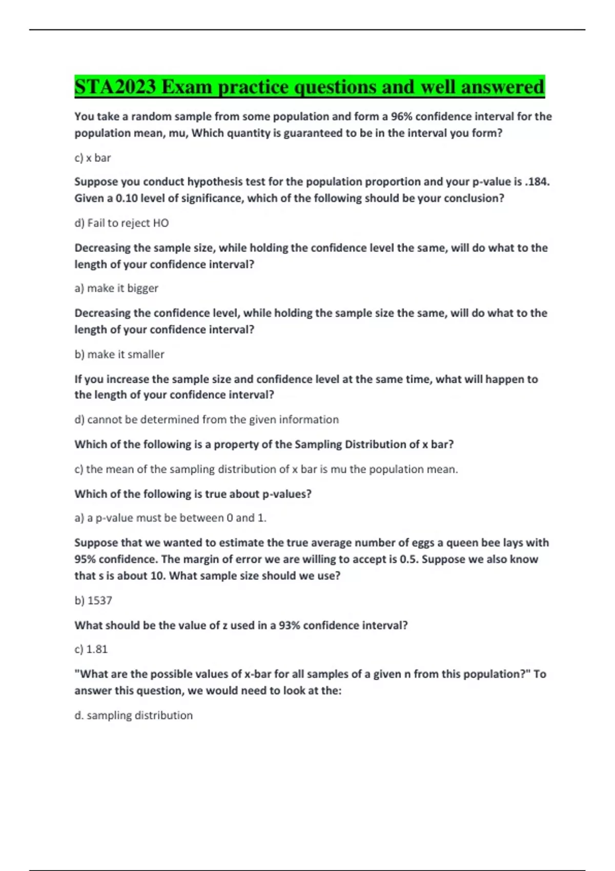 STA2023 Exam practice questions and well answered