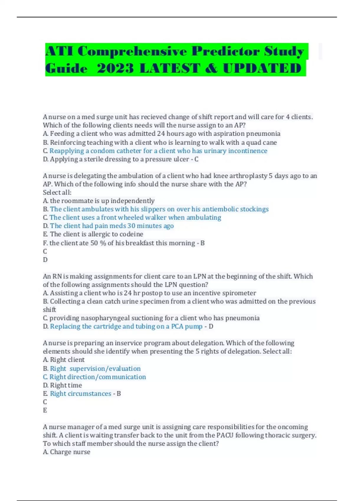 ATI Comprehensive Predictor Study Guide 2023 LATEST & UPDATED A nurse on a med surge unit has recieved change of shift report and will care for 4 clients. Which of the following clients needs will the nurse assign to an AP? A. Feeding a client who was admitted 24 hours ago with aspiration pneumonia B. Reinforcing teaching with a client who is learning to walk with a quad cane C. Reapplying a condom catheter for a client who has urinary incontinence D. Applying a sterile dressing to a pressure ulcer - C A nurse is delegating the ambulation of a client who had knee arthroplasty 5 days ago to an AP. Which of the following info should the nurse share with the AP? Select all: A. the roommate is up independently B. The client ambulates with his slippers on over his antiembolic stockings C. The client uses a front wheeled walker when ambulating D. The client had pain meds 30 minutes ago E. The client is allergic to codeine F. the client ate 50 % of his breakfast this morning - B C D An RN is making assignments for client care to an LPN at the beginning of the shift. Which of the following assignments should the LPN question? A. Assisting a client who is 24 hr postop to use an incentive spirometer B. Collecting a clean catch urine specimen from a client who was admitted on the previous shift C. providing nasopharyngeal suctioning for a client who has pneumonia D. Replacing the cartridge and tubing on a PCA pump - D A nurse is preparing an inservice program about delegation. Which of the following elements should she identify when presenting the 5 rights of delegation. Select all: A. Right client B. Right supervision/evaluation C. Right direction/communication D. Right time E. Right circumstances - B C E A nurse manager of a med surge unit is assigning care responsibilities for the oncoming shift. A client is waiting transfer back to the unit from the PACU following thoracic surgery. To which staff member should the nurse assign the client? A. Charge nurse B. RN C. LVN D. AP - B What is the study of conduct and character? - Ethics What are the values and beliefs that guide behavior and decision making? - Morals What is the right to make ones own personal decisions, even tho those decisions might not be in the persons best interest - Autonomy What are positive actions to help others - Beneficience What is an agreement to keep promises - Fidelity What is fairness in care delivery and use of resources - Justice What is avoidance of harm or injury - Non-maleficence A nurse is caring for a client who decides not to have surgery despite significant blockages in his coronary arteries. The nurse understands that this clients choice is an example of what principles? A. Fidelity B. Autonomy C. Justice D. Nonmalificience - A A nurse offers pain meds to a client who is postop prior to ambulation. The nurse understands that this aspect of care delivery is an example of which of the following ethical principles? A. Fidelity B. Autonomy C. Justice D. Beneficience - D A nurse is instructing a group of nursing students about the responsibilities involved with organ donation and procurement. When the nurse explains that all clients waiting for a kidney transplant have to meet the same qualifications, the students should understand that this aspect of care delivery is an example of which ethical principle A. Fidelity B. Autonomy C. Justice D. Nonmaleficence - C A nurse questions a med prescription as too extreme and light of the clients advanced age and unstable status. The nurse understands that this action is an example of which ethical principle A. Fidelity B. Autonomy C. Justice D. Nonmalificence - D Which of the following situations can be identified as an ethical dilemma? A. A nurse on a med surge unit demonstrates signs of chemical impairment B. A nurse over hears another nurse telling an older adult client that if he doesnt stay in bed she will restrain him C. A family has conflicting feelings about the initiation of enteral tube feedings of their father who is terminally ill D. A client who is terminally ill hesitates to name her spouse on her durable power of attorney form - C Most managers can be categorized as - authoritative, democratic, and laissez faire makes decisions of the group motivates by coercion communication occurs down the chain of command Work output by the staff is usually high-good for crisis situations and bureaucratic settings - Authoritative includes the group when decisions are made Motivates by supporting star achievements Communication occurs up and down the chain of command Work output by staff is usually of good quality-good when cooperation and collaboration is necessary - Democratic makes very few decisions and does little planning motivation is largely the responsibility of individuals staff members Communication occurs up and down the chain of command and between group members Work output is low unless an informal leader evolves from the group *the use of any of these styles may be appropriate depending on the situation - Laissez faire The nurse should consider the hierarchy of human needs when prioritizing interventions, which are? - - Physiological needs first (oxygen, shelter, food) - Safety & security needs (physical safety) - Love and belonging - Self esteem - Self actualization The ABC framework identifies, in order, the three basic needs for sustaining life - Airway Breathing Circulation Nurses must follow what code of standards in delegating and assigning tasks - ANA codes of standards What values would a nurse possess to be a client advocate? - - caring - autonomy - respect - empowerment What do the nurse need to keep in mind about the client when being their advocate? - Client's religion & culture When should planning discharge process begin? a. at time of admission b. 2 days after client is admitted c. whenever the nurse has the time to do planning d. when the physician has the discharge order - A What is an interdisciplinary team? - A group of health care professi