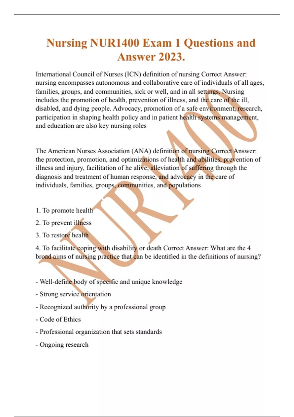 Nursing NUR1400 Exam 1 Questions and Answer 2023. International Council of Nurses (ICN) definition of nursing Correct Answer: nursing encompasses autonomous and collaborative care of individuals of all ages, families, groups, and communities, sick or well, and in all settings. Nursing includes the promotion of health, prevention of illness, and the care of the ill, disabled, and dying people. Advocacy, promotion of a safe environment, research, participation in shaping health policy and in patient health systems management, and education are also key nursing roles The American Nurses Association (ANA) definition of nursing Correct Answer: the protection, promotion, and optimizations of health and abilities, prevention of illness and injury, facilitation of he alive, alleviation of suffering through the diagnosis and treatment of human response, and advocacy in the care of individuals, families, groups, communities, and populations 1. To promote health 2. To prevent illness 3. To restore health 4. To facilitate coping with disability or death Correct Answer: What are the 4 broad aims of nursing practice that can be identified in the definitions of nursing? - Well-define body of specific and unique knowledge - Strong service orientation - Recognized authority by a professional group - Code of Ethics - Professional organization that sets standards - Ongoing research