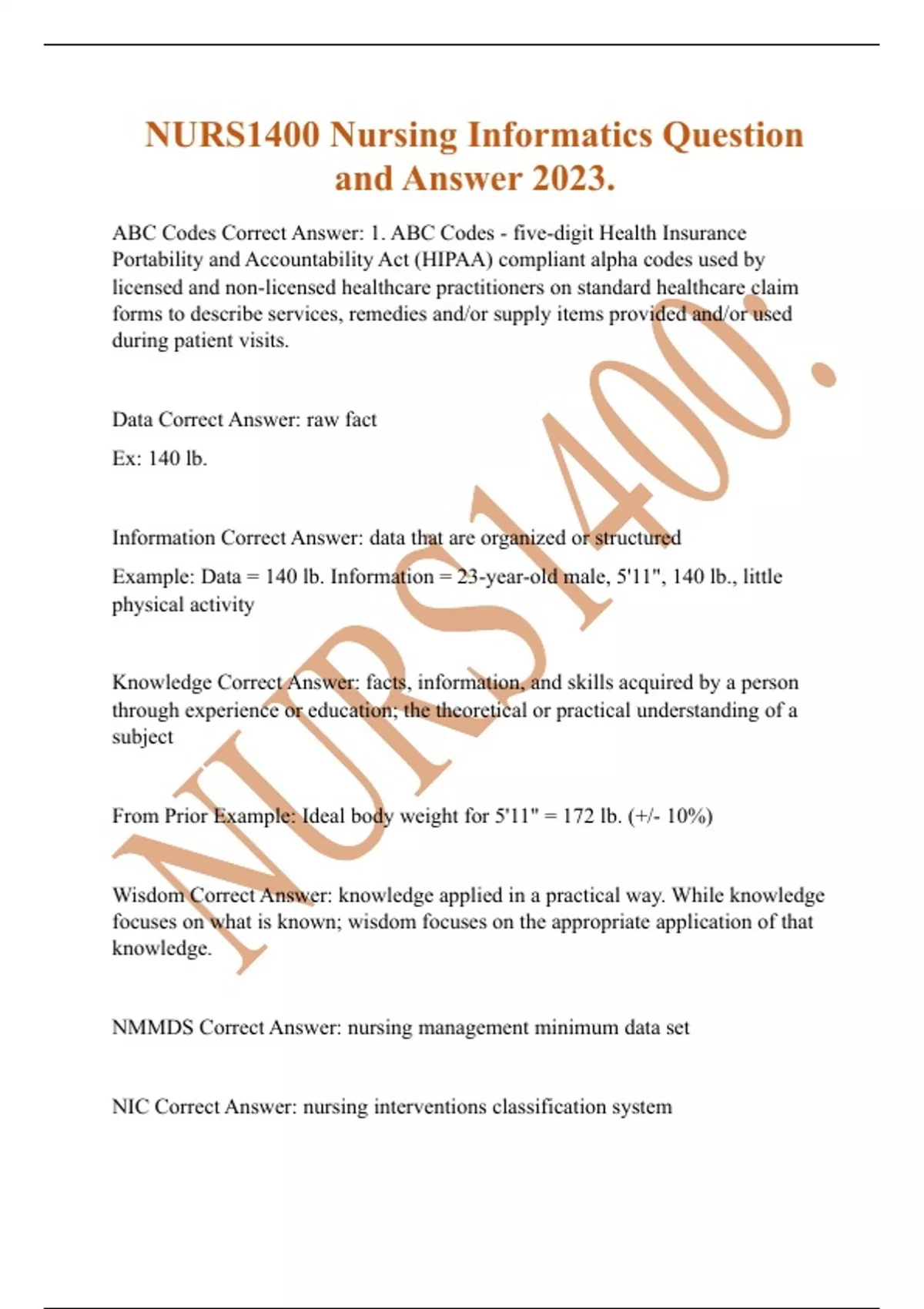 NURS1400 Nursing Informatics Question and Answer 2023. ABC Codes Correct Answer: 1. ABC Codes - five-digit Health Insurance Portability and Accountability Act (HIPAA) compliant alpha codes used by licensed and non-licensed healthcare practitioners on standard healthcare claim forms to describe services, remedies and/or supply items provided and/or used during patient visits. Data Correct Answer: raw fact Ex: 140 lb. Information Correct Answer: data that are organized or structured Example: Data = 140 lb. Information = 23-year-old male, 5'11", 140 lb., little physical activity Knowledge Correct Answer: facts, information, and skills acquired by a person through experience or education; the theoretical or practical understanding of a subject From Prior Example: Ideal body weight for 5'11" = 172 lb. (+/- 10%) Wisdom Correct Answer: knowledge applied in a practical way. While knowledge focuses on what is known; wisdom focuses on the appropriate application of that knowledge.