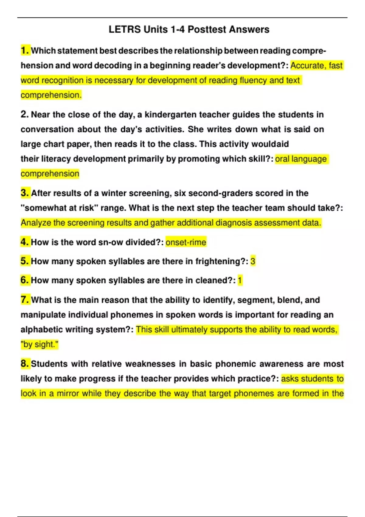 LETRS Units 1-4 Posttest Answers LETRS Units 1-4 Posttest Answers 1. Which statement best describes the relationship between reading compre- hension and word decoding in a beginning reader's development?: Near the close of the day, a kindergarten teacher guides the students in conversation about the day's activities. She writes down what is said on large chart paper, then reads it to the class. This activity would aid their literacy development primarily by promoting which skill?: After results of a winter screening, six second-graders scored in the "somewhat at risk" range. What is the next step the teacher team should take?: How is the word sn-ow divided?: How many spoken syllables are there in frightening?: How many spoken syllables are there in cleaned?: What is the main reason that the ability to identify, segment, blend, and manipulate individual phonemes in spoken words is important for reading an alphabetic writing system?: Students with relative weaknesses in basic phonemic awareness are most likely to make progress if the teacher provides which practice?: Which student is demonstrating the most advanced level of phonemic awareness?: A student spells skin as "sgin." What type of phonological error did she make?: Having students listen to a word, say it, and then mentally reverse the sounds in the word is an instructional activity that would be most appropriate for which students?: How can phonics instruction be organized to be most effective?: 2. Which word group might a teacher include in a lesson focused on iden- tification of consonant blends?: Which word group might a teacher include in a lesson focused on review- ing consonant digraphs?: In the early alphabetic phase of word-reading development, students know some letter-sound correspondences and most letter names. A student at this level is most likely to progress with what type of instruction?: Of all the phonic correspondences represented in these words, which pattern is likely to be learned after the others?: Which of the following tasks would best provide practice for automating letter recognition in kindergarteners?: Choose the best key word for introduction of short e.: Which of the following is the best example of a well-designed word list for a word-chaining activity?: A teacher has posted a word wall in first grade, using alphabetic order to list the words the students must learn. For example, under T are the words to, too, them, the, this, then. How could the teacher best ensure that students will recognize and spell these words?: A good phonics lesson should include opportunities for students to apply the phoneme-grapheme relationships that have been explicitly taught. Which text type would best provide the practice needed?: In which word does the grapheme representing /k/ indicate that the word is probably from Greek?: Which of the following words is most probably "Latin-based"?: Which of the following is a feature of English spelling?: In phoneme-grapheme mapping, students first segment and mark boxes for the phonemes. Then, they map the graphemes. If students were mapping the graphemes in this word, how many boxes (phonemes) would they need? wife: In phoneme-grapheme mapping, students first segment and mark boxes for the phonemes. Then, they map the grapheme. If students were mapping the grapheme in this word, how many boxes (phonemes) would the need? dodged: In phoneme-grapheme mapping, students first segment and mark boxes for the phonemes. Then, they map the graphemes. If students were mapping the graphemes in this word, how many boxes (phonemes) would they need? void: In the phoneme-grapheme mapping, students first segment and mark boxes for the phonemes. Then, they map the graphemes. If students were mapping the graphemes in this word, how many boxes would they need? stream: If phoneme-grapheme mapping, students first segment and mark boxes for the phonemes. Then, the map the graphemes. If students were mapping the graphemes in this word, how many boxes would they need? blaming: If phoneme-grapheme mapping, students first segment ad mark boxes for the phonemes. Then, they map the graphemes. If students were mapping the graphemes in this word, how many boxes would they need? thrill: Which three letters could signal that ci is pronounced /s/?: The /k/ sound in lake and lack is speed differently. Why do we use the ck spelling in lack?: Which one of the following two-syllable words contains an open syllable and a closed syllable?: Which one of the following two-syllable words contains a vowel team syllable and a syllable with a vowel-pattern?: A second-grade student writes, "I have finely finished my math project." Her misspelling of the word finally most likely indicates which of the follow- ing?: Which word might be found in a lesson on adjective suffixes?: How can a teacher explain to students why there is a double n in begin- ning?: Which of the following misspelled words would be considered to be a morphological spelling error?: Which of the following is a phonologically based spelling error?: 3. The best definition of reading fluency is which of the following?: To support students' automatic word recognition, a first-grade teacher should first teach students which strategy?: If a second-grader lacks fluency when reading aloud, what is the lan- guage skill that the teacher should assess first?: If a midyear first-grader reaches benchmark on screening for correct letter sounds, but does not read any whole words accurately when asked to read simple nonsense syllables, what type of instruction should this student receive?: Which of these students has the greatest need for intervention focused on systematic, explicit phonics instruction?: