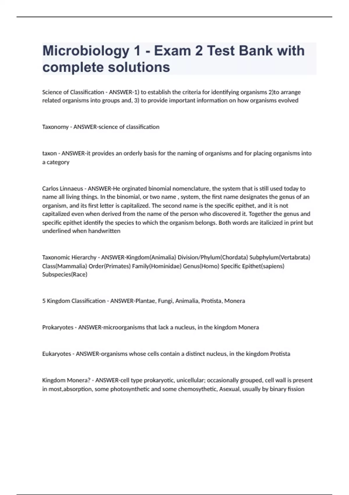 Microbiology 1 - Exam 2 Test Bank with complete solutions Science of Classification - ANSWER-1) to establish the criteria for identifying organisms 2)to arrange related organisms into groups and, 3) to provide important information on how organisms evolved Taxonomy - ANSWER-science of classification taxon - ANSWER-it provides an orderly basis for the naming of organisms and for placing organisms into a category Carlos Linnaeus - ANSWER-He orginated binomial nomenclature, the system that is still used today to name all living things. In the binomial, or two name , system, the first name designates the genus of an organism, and its first letter is capitalized. The second name is the specific epithet, and it is not capitalized even when derived from the name of the person who discovered it. Together the genus and specific epithet identify the species to which the organism belongs. Both words are italicized in print but underlined when handwritten Taxonomic Hierarchy - ANSWER-Kingdom(Animalia) Division/Phylum(Chordata) Subphylum(Vertabrata) Class(Mammalia) Order(Primates) Family(Hominidae) Genus(Homo) Specific Epithet(sapiens) Subspecies(Race) 5 Kingdom Classification - ANSWER-Plantae, Fungi, Animalia, Protista, Monera Prokaryotes - ANSWER-microorganisms that lack a nucleus, in the kingdom Monera Eukaryotes - ANSWER-organisms whose cells contain a distinct nucleus, in the kingdom Protista Kingdom Monera? - ANSWER-cell type prokaryotic, unicellular; occasionally grouped, cell wall is present in most,absorption, some photosynthetic and some chemosythetic, Asexual, usually by binary fission