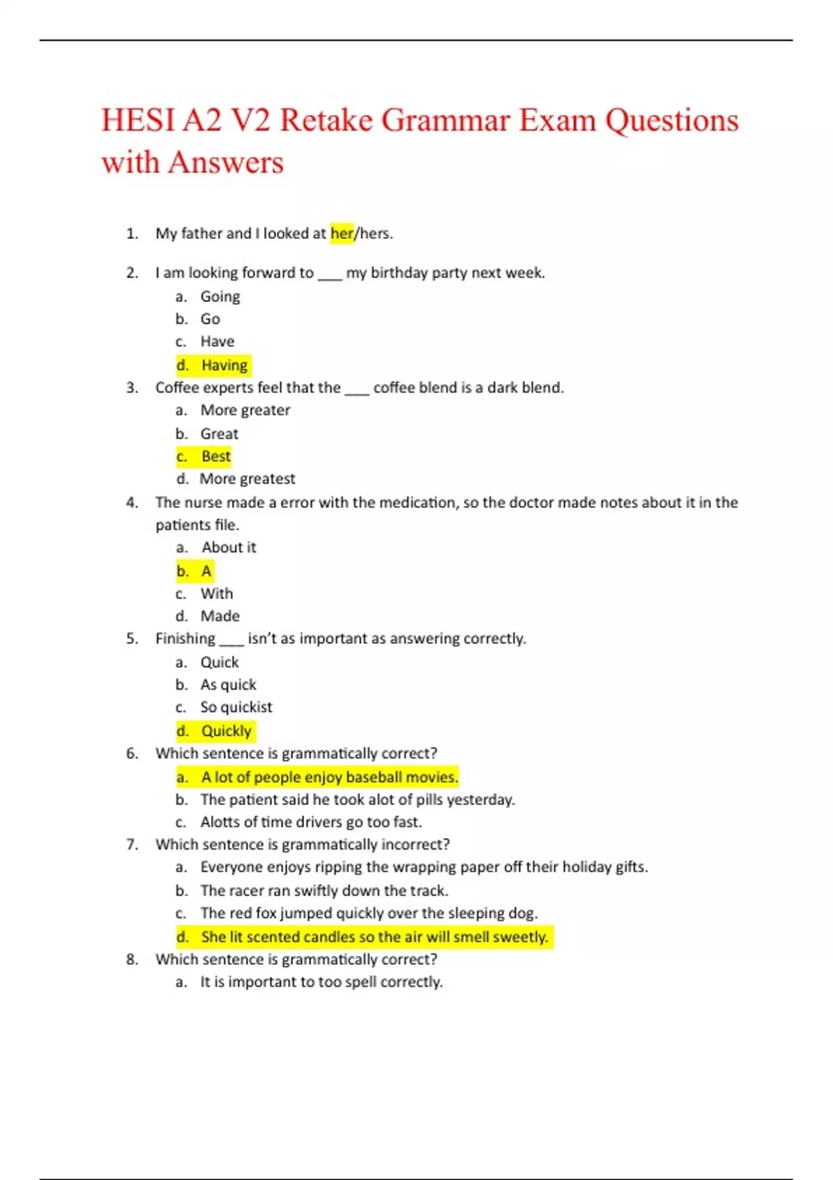 hesi a2 v2 retake grammar exam questions with answ