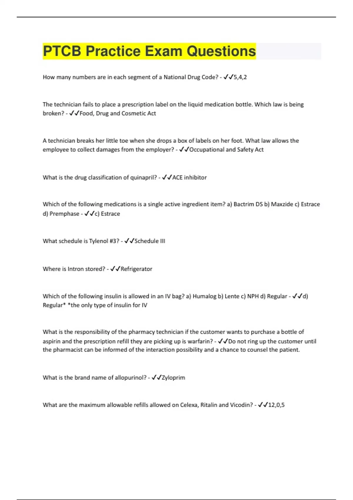 How many numbers are in each segment of a National Drug Code? - 5,4,2 The technician fails to place a prescription label on the liquid medication bottle. Which law is being broken? - Food, Drug and Cosmetic Act A technician breaks her little toe when she drops a box of labels on her foot. What law allows the employee to collect damages from the employer? - Occupational and Safety Act What is the drug classification of quinapril? - ACE inhibitor Which of the following medications is a single active ingredient item? a) Bactrim DS b) Maxzide c) Estrace d) Premphase - c) Estrace What schedule is Tylenol #3? - Schedule III Where is Intron stored? - Refrigerator Which of the following insulin is allowed in an IV bag? a) Humalog b) Lente c) NPH d) Regular - d) Regular* *the only type of insulin for IV What is the responsibility of the pharmacy technician if the customer wants to purchase a bottle of aspirin and the prescription refill they are picking up is warfarin? - Do not ring up the customer until the pharmacist can be informed of the interaction possibility and a chance to counsel the patient. What is the brand name of allopurinol? - Zyloprim What are the maximum allowable refills allowed on Celexa, Ritalin and Vicodin? - 12,0,5